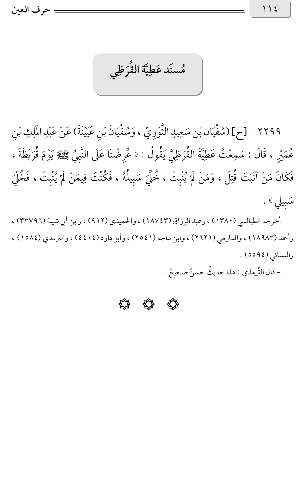 ٢٢٩٩ - [ح] (سُفْيَان بْن سَعِيدٍ الثَّوْرِيّ، وَسُفْيَانَ بْنِ عُيَيْنَةَ) عَنْ عَبْدِ المَلِكِ بْنِ عُمَيْرٍ، قَالَ: سَمِعْتُ عَطِيَّةَ القُرَظِيَّ يَقُولُ: «عُرِضْنَا عَلَى النَّبِيِّ صلى الله عليه وسلم يَوْمَ قُرَيْظَةَ، فَكَانَ مَنْ أنْبَتَ قُتِلَ، وَمَنْ لَمْ يُنْبِتْ، خُلِّيَ سَبِيلُهُ، فَكُنْتُ فِيمَنْ لَمْ يُنْبِتْ، فَخُلِّيَ سَبِيلي».