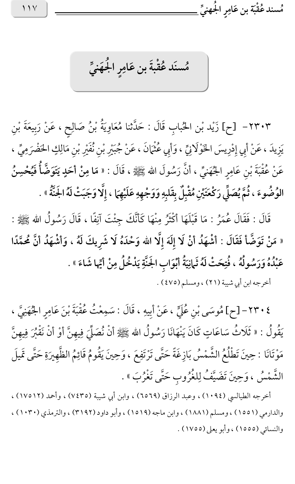 ٢٣٠٣ - [ح] زَيْد بْن الحُبابِ قَالَ: حَدَّثنا مُعَاوِيَةُ بْنُ صَالِحٍ، عَنْ رَبِيعَةَ بْنِ يَزِيدَ، عَنْ أبِي إِدْرِيسَ الخَوْلَانِيِّ، وَأبِي عُثْمَانَ، عَنْ جُبَيْرِ بْنِ نُفَيْرِ بْنِ مَالِكٍ الحَضْرَمِيِّ، عَنْ عُقْبَةَ بْنِ عَامِرٍ الجُهَنيِّ، أنَّ رَسُولَ الله صلى الله عليه وسلم، قَالَ: «مَا مِنْ أحَدٍ يَتَوَضَّأُ فَيُحْسِنُ الوُضُوءَ، ثُمَّ يُصَلِّي رَكْعَتَيْنِ مُقْبِلٌ بِقَلبِهِ وَوَجْهِهِ عَلَيْهِمَا، إِلَّا وَجَبَتْ لَهُ الجَنَّةُ».