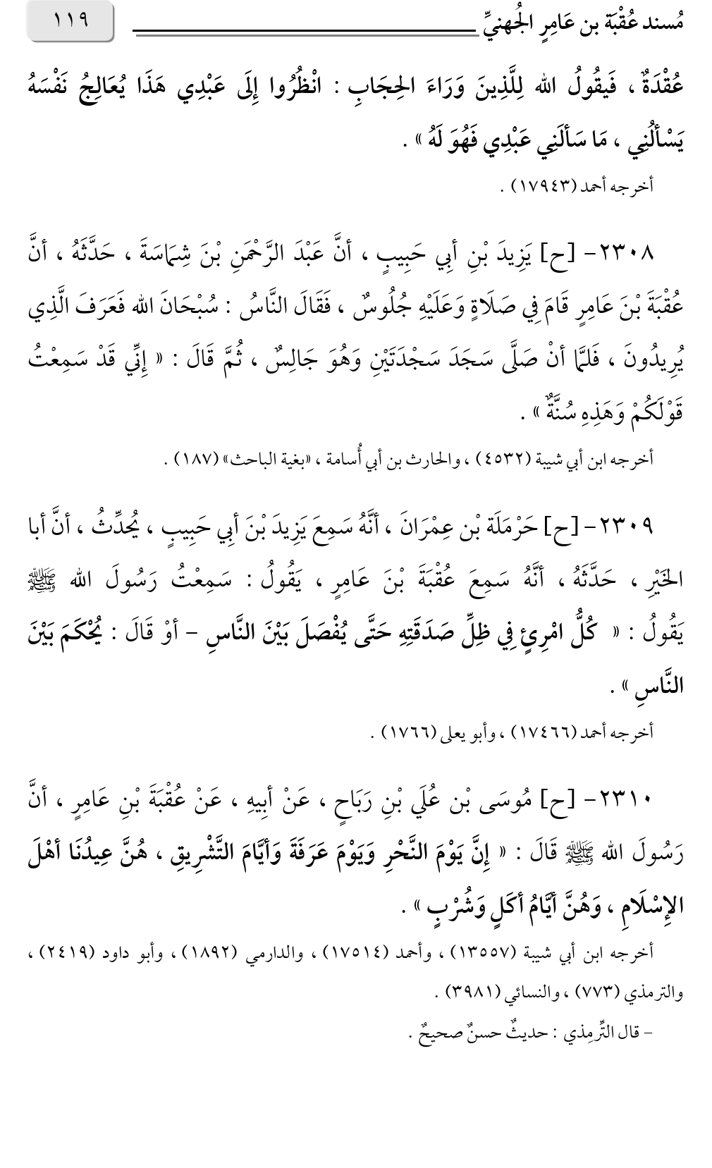 ٢٣٠٩ - [ح] حَرْمَلَة بْن عِمْرَانَ، أنَّهُ سَمِعَ يَزِيدَ بْنَ أبِي حَبِيبٍ، يُحدِّثُ، أنَّ أبا الخَيْرِ، حَدَّثَهُ، أنَّهُ سَمِعَ عُقْبَةَ بْنَ عَامِرٍ، يَقُولُ: سَمِعْتُ رَسُولَ الله صلى الله عليه وسلم يَقُولُ: «كُلُّ امْرِئٍ فِي ظِلِّ صَدَقَتِهِ حَتَّى يُفْصَلَ بَيْنَ النَّاسِ - أوْ قَالَ: يُحْكَمَ بَيْنَ النَّاسِ».