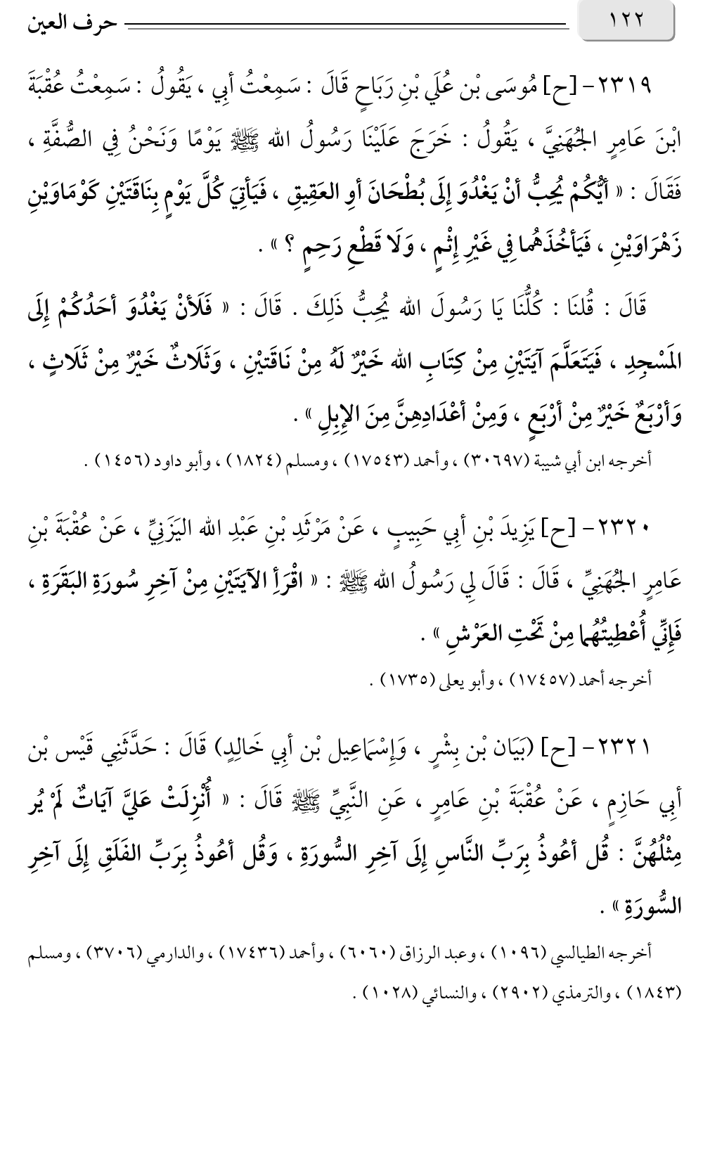 ٢٣١٩ - [ح] مُوسَى بْن عُلَي بْنِ رَبَاحٍ قَالَ: سَمِعْتُ أبِي، يَقُولُ: سَمِعْتُ عُقْبَةَ ابْنَ عَامِرٍ الجُهَنِيَّ، يَقُولُ: خَرَجَ عَلَيْنَا رَسُولُ الله صلى الله عليه وسلم يَوْمًا وَنَحْنُ فِي الصُّفَّةِ، فَقَالَ: «أيُّكُمْ يُحِبُّ أنْ يَغْدُوَ إِلَى بُطْحَانَ أوِ العَقِيقِ، فَيَأتِيَ كُلَّ يَوْمٍ بِنَاقَتَيْنِ كَوْمَاوَيْنِ؟ زَهْرَاوَيْنِ، فَيَأخُذَهُما فِي غَيْرِ إِثْمٍ، وَلَا قَطْعِ رَحِمٍ».