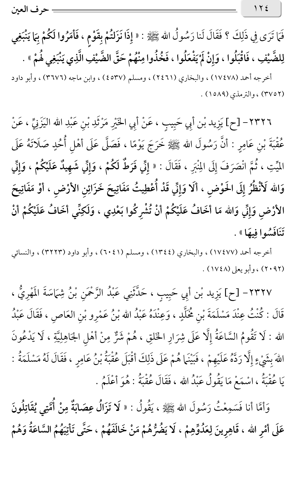 ٢٣٢٦ - [ح] يَزِيد بْن أبِي حَبِيبٍ، عَنْ أبِي الخَيْرِ مَرْثَدِ بْنِ عَبْدِ الله اليَزَنِيِّ، عَنْ عُقْبَةَ بْنِ عَامِرٍ: أنَّ رَسُولَ الله صلى الله عليه وسلم خَرَجَ يَوْمًا، فَصَلَّى عَلَى أهْلِ أُحُدٍ صَلَاتَهُ عَلَى الميِّتِ، ثُمَّ انْصَرَفَ إِلَى المِنْبَرِ، فَقَالَ: «إِنِّي فَرَطٌ لَكُمْ، وَإِنِّي شَهِيدٌ عَلَيْكُمْ، وَإِنِّي وَالله لَأنْظُرُ إِلَى الحَوْضِ، ألَا وَإِنِّي قَدْ أُعْطِيتُ مَفَاتِيحَ خَزَائِنِ الأرْضِ، أوْ مَفَاتِيحَ الأرْضِ وَإِنِّي وَالله مَا أخَافُ عَلَيْكُمْ أنْ تُشْرِكُوا بَعْدِي، وَلَكِنِّي أخَافُ عَلَيْكُمْ أنْ تَنَافَسُوا فِيهَا».