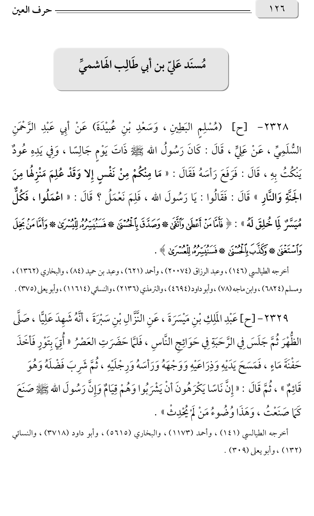 ٢٣٢٩ - [ح] عَبْدِ المَلِكِ بْنِ مَيْسَرَةَ، عَنِ النَّزَّالِ بْنِ سَبْرَةَ، أنَّهُ شَهِدَ عَلِيًّا، صَلَّى الظُّهْرَ ثُمَّ جَلَسَ فِي الرَّحَبَةِ فِي حَوَائِجِ النَّاسِ، فَلمَّا حَضَرَتِ العَصْرُ «أُتِيَ بِتَوْرٍ فَأخَذَ حَفْنَةَ مَاءٍ، فَمَسَحَ يَدَيْهِ وَذِرَاعَيْهِ وَوَجْهَهُ وَرَأسَهُ وَرِجْلَيْهِ، ثُمَّ شَرِبَ فَضْلَهُ وَهُوَ قَائِمٌ» ثُمَّ قَالَ: «إِنَّ نَاسًا يَكْرَهُونَ أنْ يَشْرَبُوا وَهُمْ قِيَامٌ وَإِنَّ رَسُولَ الله صلى الله عليه وسلم صَنَعَ كَمَا صَنَعْتُ، وَهَذَا وُضُوءُ مَنْ لَمْ يُحْدِثْ».