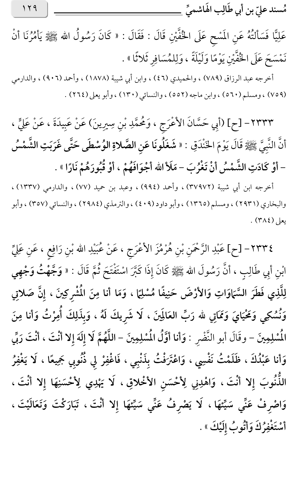 أخرجه عبد الرزاق (٧٨٩)، والحميدي (٤٦)، وابن أبي شيبة (١٨٧٨)، وأحمد (٩٠٦)، والدارمي (٧٥٩)، ومسلم (٥٦٠)، وابن ماجة (٥٥٢)، والنسائي (١٣٠)، وأبو يعلى (٢٦٤).
