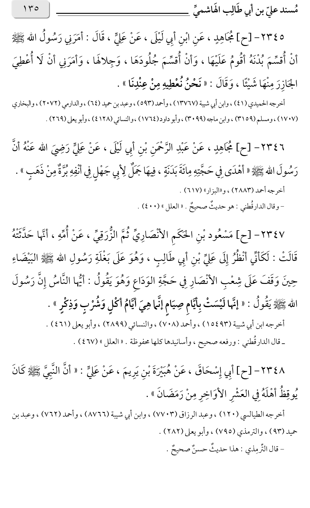 ٢٣٤٦ - [ح] مُجَاهِدٍ، عَنْ عَبْدِ الرَّحْمَنِ بْنِ أبِي لَيْلَى، عَنْ عَلِيٍّ رَضِيَ الله عَنْهُ أنَّ رَسُولَ الله صلى الله عليه وسلم «أهْدَى فِي حَجَّتِهِ مِائَةَ بَدَنَةٍ، فِيهَا جَمَلٌ لِأبِي جَهْلٍ فِي أنْفِهِ بُرَّةٌ مِنْ ذَهَبٍ».