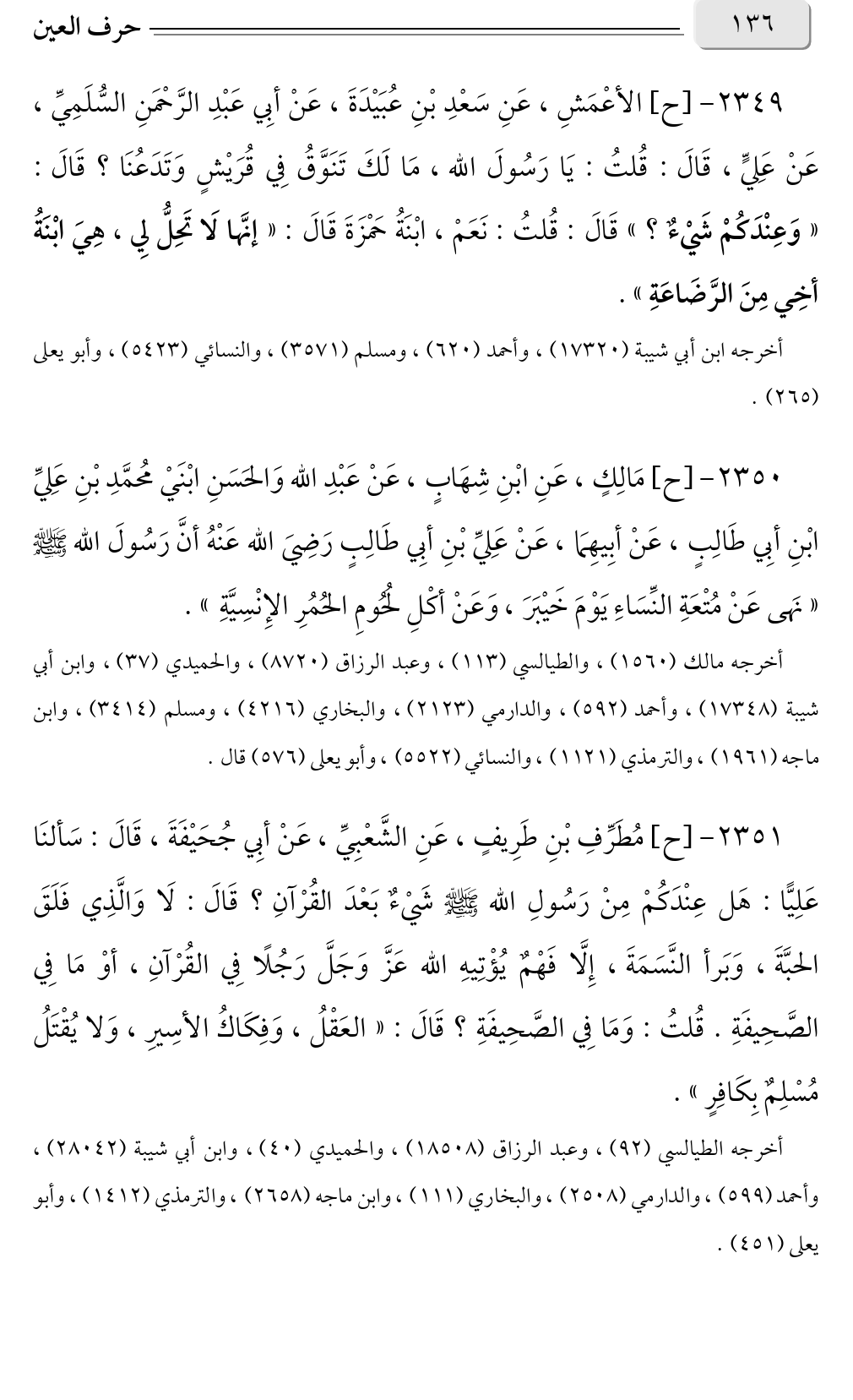 ٢٣٥١ - [ح] مُطَرِّفِ بْنِ طَرِيفٍ، عَنِ الشَّعْبِيِّ، عَنْ أبِي جُحَيْفَةَ، قَالَ: سَألنَا عَلِيًّا: هَل عِنْدَكُمْ مِنْ رَسُولِ الله صلى الله عليه وسلم شَيْءٌ بَعْدَ القُرْآنِ؟ قَالَ: لَا وَالَّذِي فَلَقَ الحبَّةَ، وَبَرأ النَّسَمَةَ، إِلَّا فَهْمٌ يُؤْتِيهِ الله عَزَّ وَجَلَّ رَجُلًا فِي القُرْآنِ، أوْ مَا فِي الصَّحِيفَةِ. قُلتُ: وَمَا فِي الصَّحِيفَةِ؟ قَالَ: «العَقْلُ، وَفِكَاكُ الأسِيرِ، وَلا يُقْتَلُ مُسْلِمٌ بِكَافِرٍ».