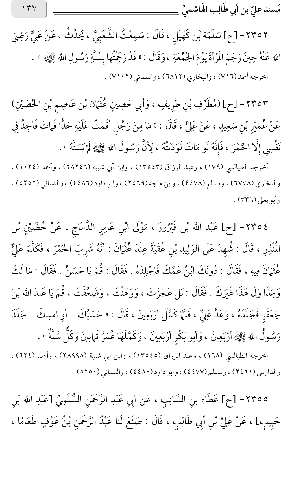 ٢٣٥٣ - [ح] (مُطَرِّفِ بْنِ طَرِيفٍ، وَأبِي حَصِينٍ عُثْمَان بْن عَاصِمِ بْنِ الحُصَيْنِ) عَنْ عُمَيْرِ بْنِ سَعِيدٍ، عَنْ عَلِيٍّ، قَالَ: «مَا مِنْ رَجُلٍ أقَمْتُ عَلَيْهِ حَدًّا فَماتَ فَأجِدُ فِي نَفْسِي إِلَّا الخَمْرَ، فَإِنَّهُ لَوْ مَاتَ لَوَدَيْتُهُ، لِأنَّ رَسُولَ الله صلى الله عليه وسلم لَمْ يَسُنَّهُ».