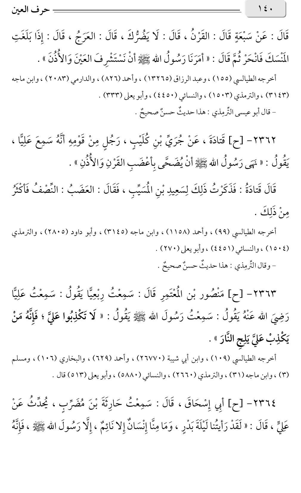 - قال أبو عيسى التِّرمِذي: هذا حديثٌ حسنٌ صحيحٌ. ٢٣٦٢ - [ح] قَتادَةَ، عَنْ جُرَيِّ بْنِ كُلَيْبٍ، رَجُلٍ مِنْ قَوْمِهِ أنَّهُ سَمِعَ عَلِيًّا، يَقُولُ: «نَهَى رَسُولُ الله صلى الله عليه وسلم أنْ يُضَحَّى بِأعْضَبِ القَرْنِ وَالأُذُنِ».