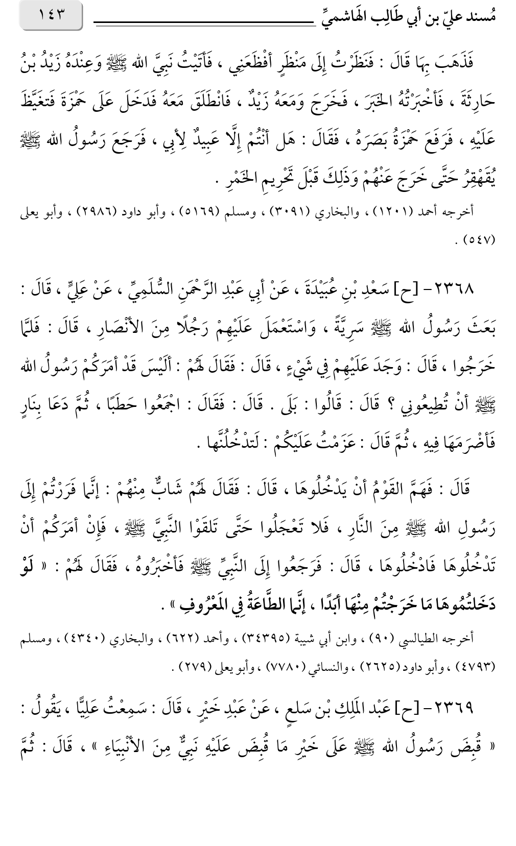 أخرجه الطيالسي (٩٠)، وابن أبي شيبة (٣٤٣٩٥)، وأحمد (٦٢٢)، والبخاري (٤٣٤٠)، ومسلم (٤٧٩٣)، وأبو داود (٢٦٢٥)، والنسائي (٧٧٨٠)، وأبو يعلى (٢٧٩).