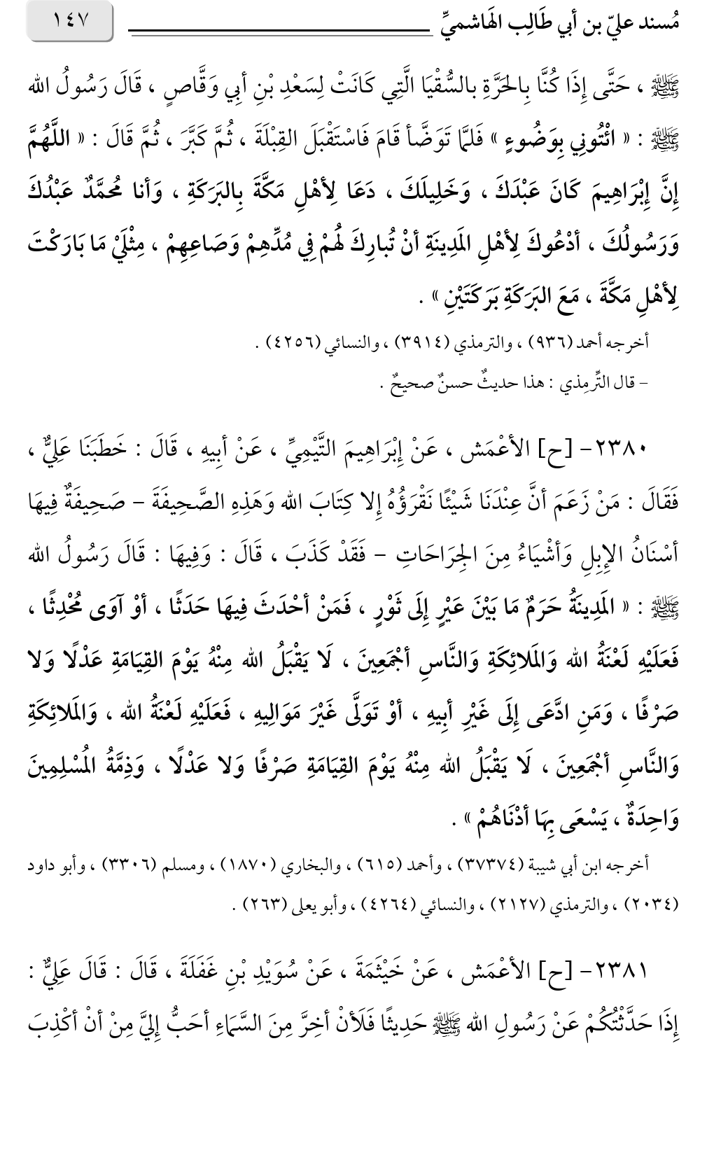 ٢٣٨٠ - [ح] الأعْمَش، عَنْ إِبْرَاهِيمَ التَّيْمِيِّ، عَنْ أبِيهِ، قَالَ: خَطَبَنَا عَلِيٌّ، فَقَالَ: مَنْ زَعَمَ أنَّ عِنْدَنَا شَيْئًا نَقْرَؤُهُ إِلا كِتَابَ الله وَهَذِهِ الصَّحِيفَةَ - صَحِيفَةٌ فِيهَا أسْنَانُ الإِبِلِ وَأشْيَاءُ مِنَ الجِرَاحَاتِ - فَقَدْ كَذَبَ، قَالَ: وَفِيهَا: قَالَ رَسُولُ الله صلى الله عليه وسلم: «المَدِينَةُ حَرَمٌ مَا بَيْنَ عَيْرٍ إِلَى ثَوْرٍ، فَمَنْ أحْدَثَ فِيهَا حَدَثًا، أوْ آوَى مُحْدِثًا، فَعَلَيْهِ لَعْنَةُ الله وَالمَلائِكَةِ وَالنَّاسِ أجْمَعِينَ، لَا يَقْبَلُ الله مِنْهُ يَوْمَ القِيَامَةِ عَدْلًا وَلا صَرْفًا، وَمَنِ ادَّعَى إِلَى غَيْرِ أبِيهِ، أوْ تَوَلَّى غَيْرَ مَوَالِيهِ، فَعَلَيْهِ لَعْنَةُ الله، وَالمَلائِكَةِ وَالنَّاسِ أجْمَعِينَ، لَا يَقْبَلُ الله مِنْهُ يَوْمَ القِيَامَةِ صَرْفًا وَلا عَدْلًا، وَذِمَّةُ المُسْلِمِينَ وَاحِدَةٌ، يَسْعَى بِهَا أدْنَاهُمْ».