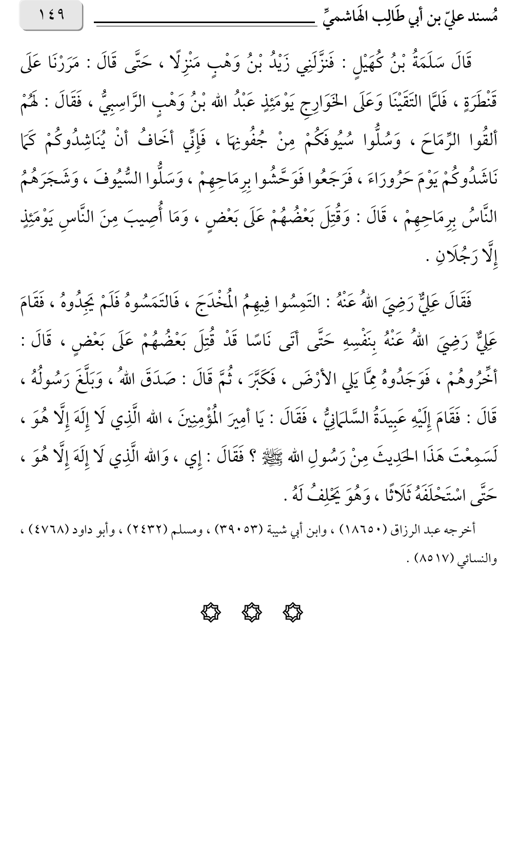فَقَالَ عَلِيٌّ رَضِيَ اللهُ عَنْهُ: التَمِسُوا فِيهِمُ المُخْدَجَ، فَالتَمَسُوهُ فَلَمْ يَجِدُوهُ، فَقَامَ عَلِيٌّ رَضِيَ اللهُ عَنْهُ بِنَفْسِهِ حَتَّى أتَى نَاسًا قَدْ قُتِلَ بَعْضُهُمْ عَلَى بَعْضٍ، قَالَ: أخِّرُوهُمْ، فَوَجَدُوهُ مِمَّا يَلي الأرْضَ، فَكَبَّرَ، ثُمَّ قَالَ: صَدَقَ اللهُ، وَبَلَّغَ رَسُولُهُ، قَالَ: فَقَامَ إِلَيْهِ عَبِيدَةُ السَّلمَانِيُّ، فَقَالَ: يَا أمِيرَ المُؤْمِنِينَ، الله الَّذِي لَا إِلَهَ إِلَّا هُوَ، لَسَمِعْتَ هَذَا الحَدِيثَ مِنْ رَسُولِ الله صلى الله عليه وسلم؟ فَقَالَ: إِي، وَالله الَّذِي لَا إِلَهَ إِلَّا هُوَ، حَتَّى اسْتَحْلَفَهُ ثَلَاثًا، وَهُوَ يَحْلِفُ لَهُ.