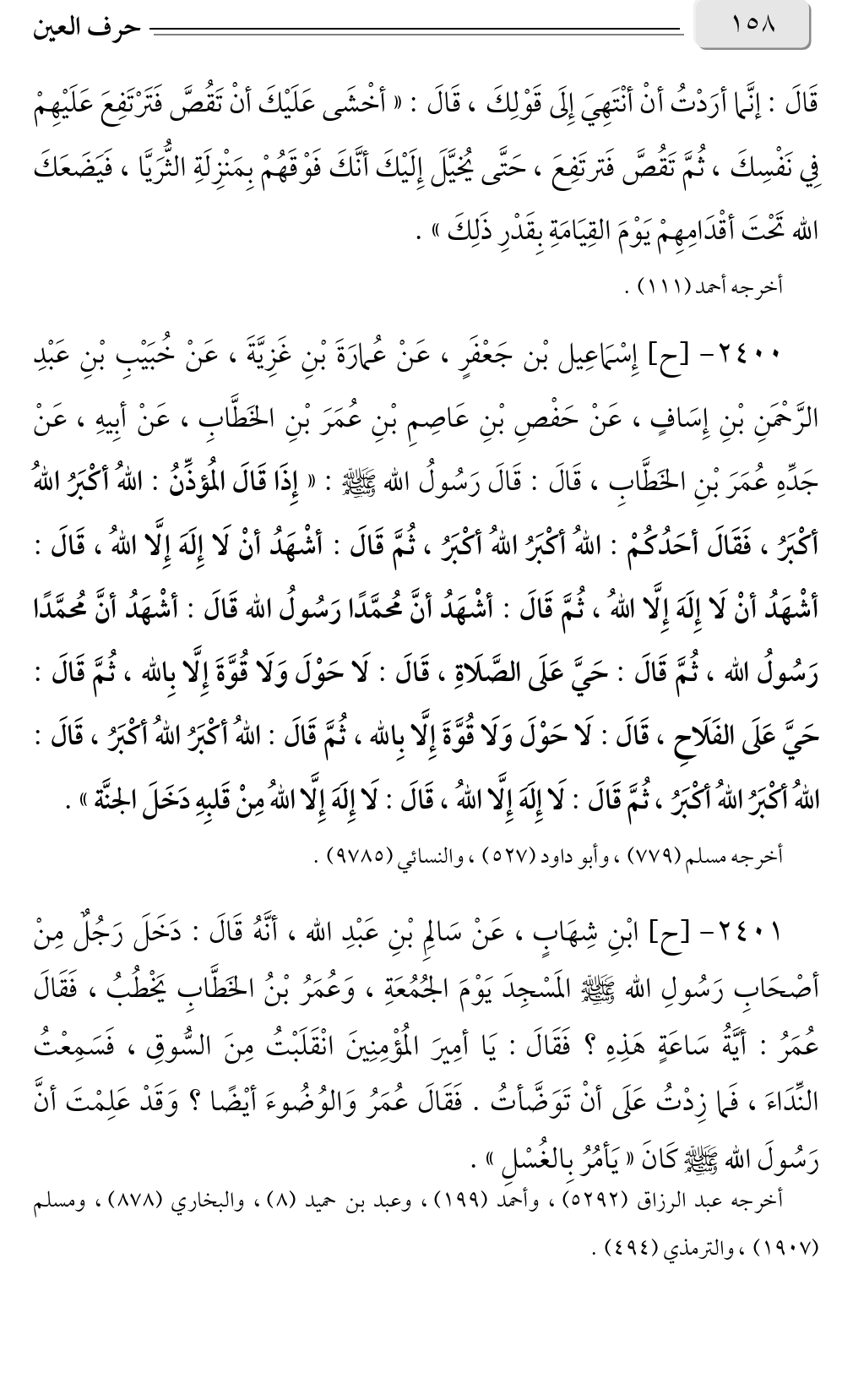 ٢٤٠٠ - [ح] إِسْمَاعِيل بْن جَعْفَرٍ، عَنْ عُمارَةَ بْنِ غَزِيَّةَ، عَنْ خُبَيْبِ بْنِ عَبْدِ الرَّحْمَنِ بْنِ إِسَافٍ، عَنْ حَفْصِ بْنِ عَاصِمِ بْنِ عُمَرَ بْنِ الخَطَّابِ، عَنْ أبِيهِ، عَنْ جَدِّهِ عُمَرَ بْنِ الخَطَّابِ، قَالَ: قَالَ رَسُولُ الله صلى الله عليه وسلم: «إِذَا قَالَ المُؤذِّنُ: اللهُ أكْبَرُ اللهُ أكْبَرُ، فَقَالَ أحَدُكُمْ: اللهُ أكْبَرُ اللهُ أكْبَرُ، ثُمَّ قَالَ: أشْهَدُ أنْ لَا إِلَهَ إِلَّا اللهُ، قَالَ: أشْهَدُ أنْ لَا إِلَهَ إِلَّا اللهُ، ثُمَّ قَالَ: أشْهَدُ أنَّ مُحمَّدًا رَسُولُ الله قَالَ: أشْهَدُ أنَّ مُحمَّدًا رَسُولُ الله، ثُمَّ قَالَ: حَيَّ عَلَى الصَّلَاةِ، قَالَ: لَا حَوْلَ وَلَا قُوَّةَ إِلَّا بِالله، ثُمَّ قَالَ: حَيَّ عَلَى الفَلَاحِ، قَالَ: لَا حَوْلَ وَلَا قُوَّةَ إِلَّا بِالله، ثُمَّ قَالَ: اللهُ أكْبَرُ اللهُ أكْبَرُ، قَالَ: اللهُ أكْبَرُ اللهُ أكْبَرُ، ثُمَّ قَالَ: لَا إِلَهَ إِلَّا اللهُ، قَالَ: لَا إِلَهَ إِلَّا اللهُ مِنْ قَلبِهِ دَخَلَ الجنَّة».