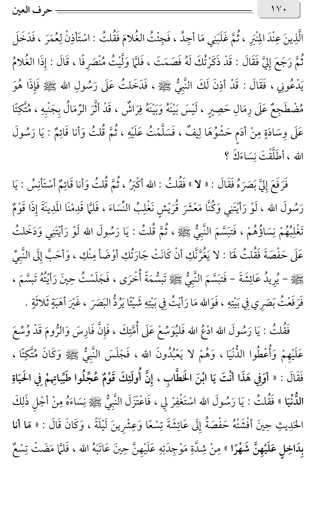 فَقُلتُ: يَا رَسُولَ الله ادْعُ الله فَليُوَسِّعْ عَلَى أُمَّتِكَ، فَإِنَّ فَارِسَ وَالرُّومَ قَدْ وُسِّعَ عَلَيْهِمْ وَأُعْطُوا الدُّنْيَا، وَهُمْ لا يَعْبُدُونَ الله، فَجَلَسَ النَّبِيُّ صلى الله عليه وسلم وَكَانَ مُتَّكِئًا، فَقَالَ: «أوَفِي هَذَا أنْتَ يَا ابْنَ الخَطَّابِ، إِنَّ أُولَئِكَ قَوْمٌ عُجِّلُوا طَيِّباتِهمْ فِي الحَيَاةِ الدُّنْيَا» فَقُلتُ: يَا رَسُولَ الله اسْتَغْفِرْ لِي، فَاعْتَزَلَ النَّبِيُّ صلى الله عليه وسلم نِسَاءَهُ مِنْ أجْلِ ذَلِكَ الحَدِيثِ حِينَ أفْشَتْهُ حَفْصَةُ إِلَى عَائِشَةَ تِسْعًا وَعِشْرِينَ لَيْلَةً، وَكَانَ قَالَ: «مَا أنا بِدَاخِلٍ عَلَيْهِنَّ شَهْرًا» مِنْ شِدَّةِ مَوْجِدَتِهِ عَلَيْهِنَّ حِينَ عَاتَبَهُ الله، فَلمَّا مَضَتْ تِسْعٌ