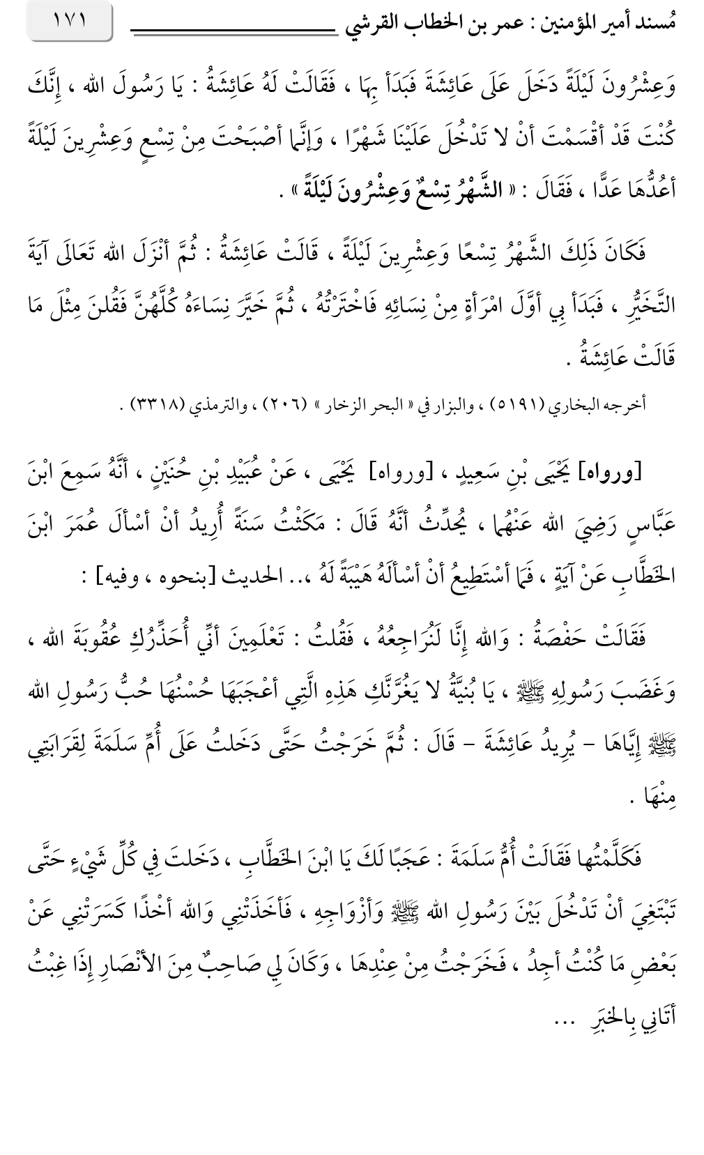 وَعِشْرُونَ لَيْلَةً دَخَلَ عَلَى عَائِشَةَ فَبَدَأ بِهَا، فَقَالَتْ لَهُ عَائِشَةُ: يَا رَسُولَ الله، إِنَّكَ كُنْتَ قَدْ أقْسَمْتَ أنْ لا تَدْخُلَ عَلَيْنَا شَهْرًا، وَإنَّما أصْبَحْتَ مِنْ تِسْعٍ وَعِشْرِينَ لَيْلَةً أعُدُّهَا عَدًّا، فَقَالَ: «الشَّهْرُ تِسْعٌ وَعِشْرُونَ لَيْلَةً».