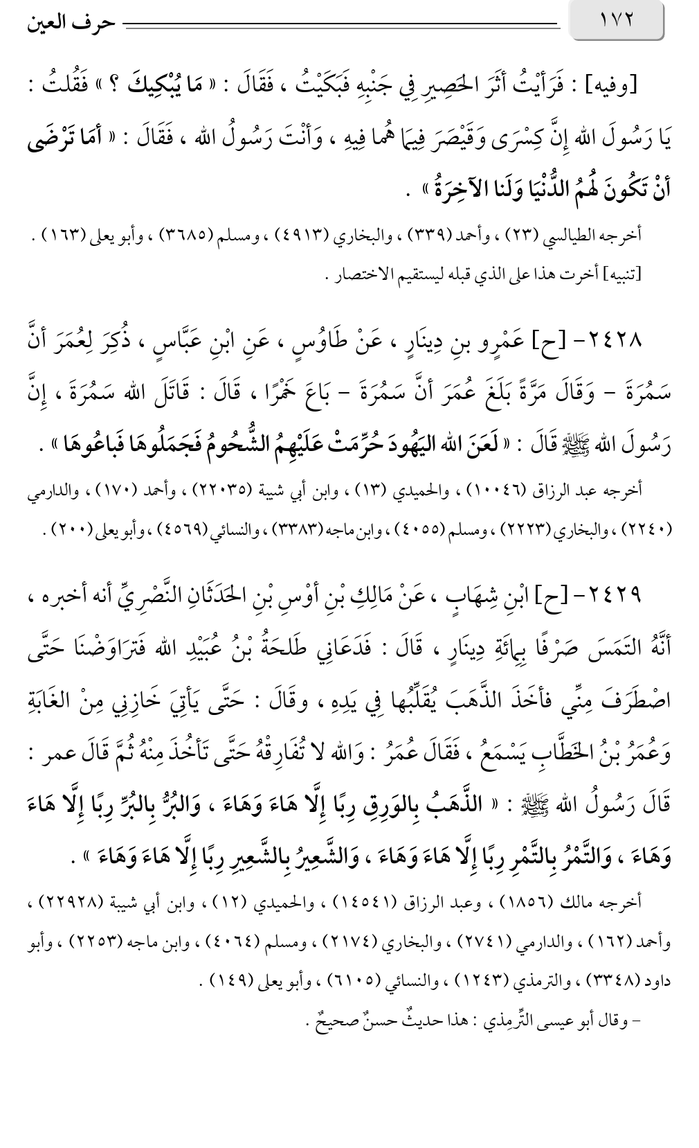 ٢٤٢٩ - [ح] ابْنِ شِهَابٍ، عَنْ مَالِكِ بْنِ أوْسِ بْنِ الحَدَثَانِ النَّصْرِيِّ أنه أخبره، أنَّهُ التَمَسَ صَرْفًا بِمِائَةِ دِينَارٍ، قَالَ: فَدَعَانِي طَلحَةُ بْنُ عُبَيْدِ الله فَترَاوَضْنَا حَتَّى اصْطَرَفَ مِنِّي فأخَذَ الذَّهَبَ يُقَلِّبُها فِي يَدِهِ، وقَالَ: حَتَّى يَأتِيَ خَازِنِي مِنْ الغَابَةِ وَعُمَرُ بْنُ الخَطَّابِ يَسْمَعُ، فَقَالَ عُمَرُ: وَالله لا تُفَارِقْهُ حَتَّى تَأخُذَ مِنْهُ ثُمَّ قَالَ عمر: قَالَ رَسُولُ الله صلى الله عليه وسلم: «الذَّهَبُ بِالوَرِقِ رِبًا إِلَّا هَاءَ وَهَاءَ، وَالبُرُّ بِالبُرِّ رِبًا إِلَّا هَاءَ وَهَاءَ، وَالتَّمْرُ بِالتَّمْرِ رِبًا إِلَّا هَاءَ وَهَاءَ، وَالشَّعِيرُ بِالشَّعِيرِ رِبًا إِلَّا هَاءَ وَهَاءَ».