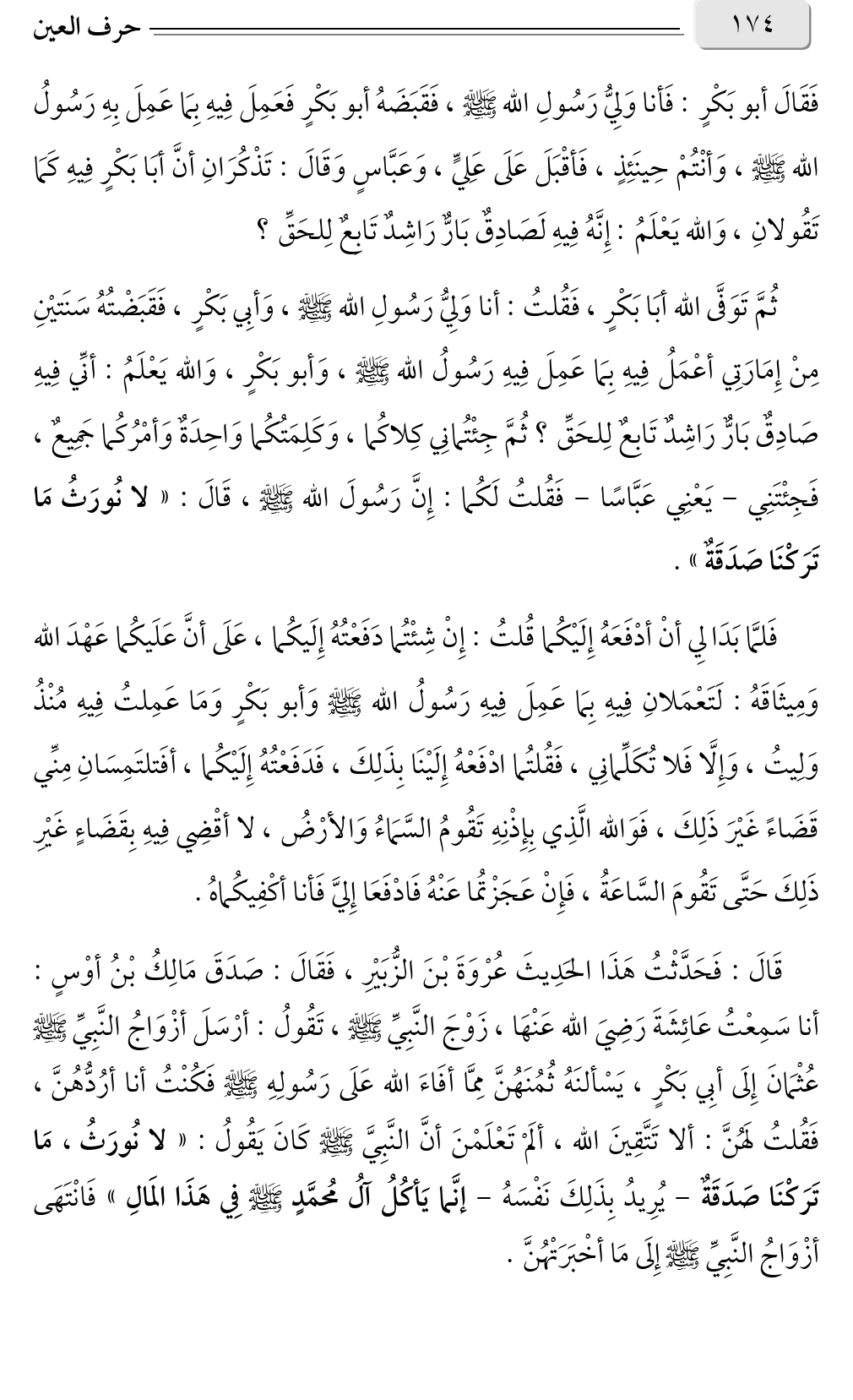 ثُمَّ تَوَفَّى الله أبَا بَكْرٍ، فَقُلتُ: أنا وَلِيُّ رَسُولِ الله صلى الله عليه وسلم، وَأبِي بَكْرٍ، فَقَبَضْتُهُ سَنَتيْنِ مِنْ إِمَارَتِي أعْمَلُ فِيهِ بِمَا عَمِلَ فِيهِ رَسُولُ الله صلى الله عليه وسلم، وَأبو بَكْرٍ، وَالله يَعْلَمُ: أنِّي فِيهِ صَادِقٌ بَارٌّ رَاشِدٌ تَابِعٌ لِلحَقِّ؟ ثُمَّ جِئْتُمانِي كِلاكُما، وَكَلِمَتُكُما وَاحِدَةٌ وَأمْرُكُما جَمِيعٌ، فَجِئْتَنِي - يَعْنِي عَبَّاسًا - فَقُلتُ لَكُما: إِنَّ رَسُولَ الله صلى الله عليه وسلم، قَالَ: «لا نُورَثُ مَا تَرَكْنَا صَدَقَةٌ».