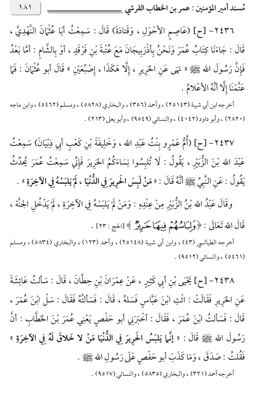 ٢٤٣٨ - [ح] يَحْيَى بْنِ أبِي كَثِيرٍ، عَنْ عِمْرَانَ بْنِ حِطَّانَ، قَالَ: سَألتُ عَائِشَةَ عَنِ الحَرِيرِ فَقَالَتْ: ائْتِ ابْنَ عَبَّاسٍ فَسَلهُ، قَالَ: فَسَألتُهُ فَقَالَ: سَلْ ابْنَ عُمَرَ، قَالَ: فَسَألتُ ابْنَ عُمَرَ، فَقَالَ: أخْبَرَنِي أبو حَفْصٍ يَعْنِي عُمَرَ بْنَ الخَطَّابِ: أنَّ رَسُولَ الله صلى الله عليه وسلم قَالَ: «إنَّما يَلبَسُ الحَرِيرَ فِي الدُّنْيَا مَنْ لا خَلاقَ لَهُ فِي الآخِرَةِ» فَقُلتُ: صَدَقَ، وَمَا كَذَبَ أبو حَفْصٍ عَلَى رَسُولِ الله صلى الله عليه وسلم.