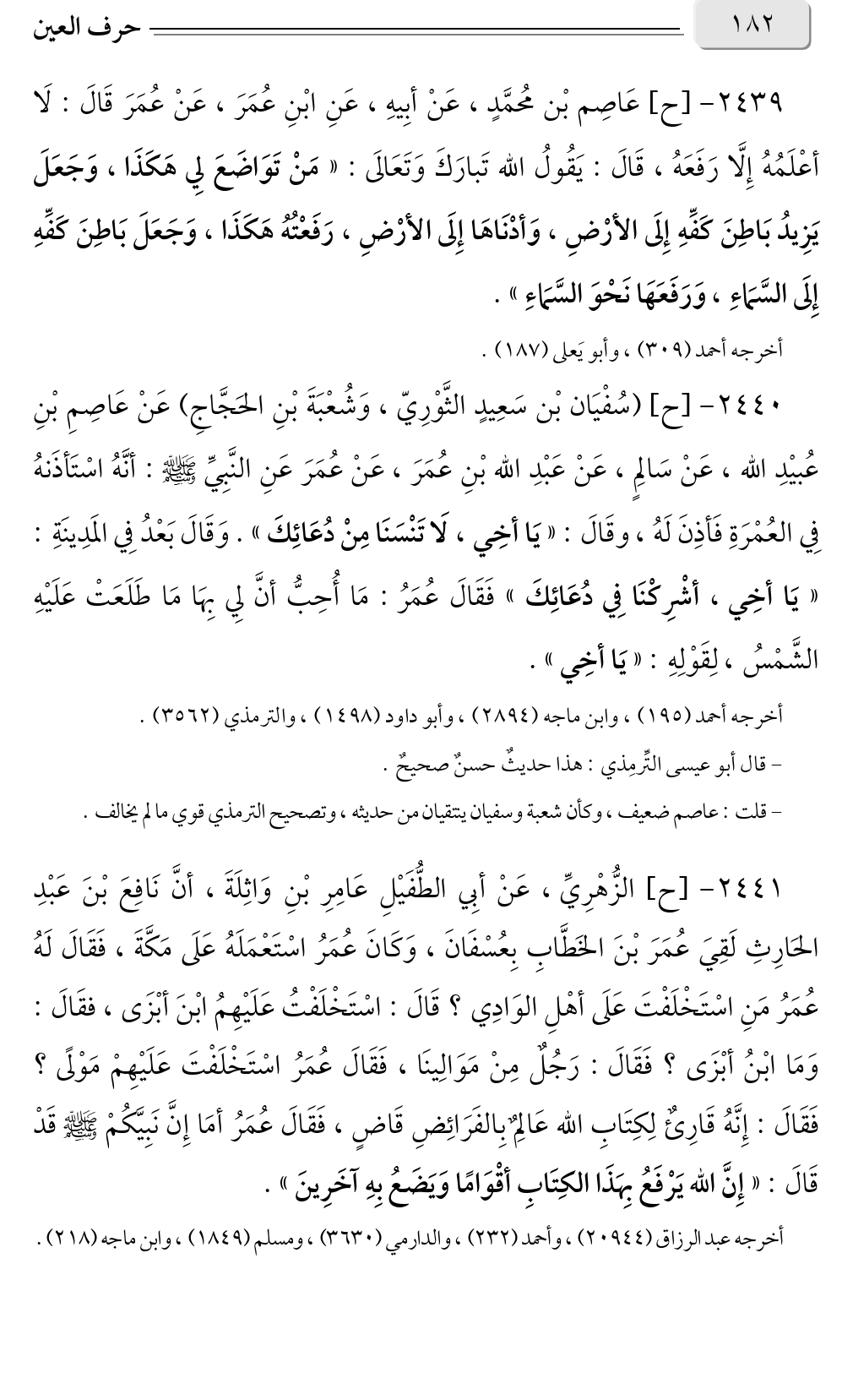 ٢٤٣٩ - [ح] عَاصِم بْن مُحمَّدٍ، عَنْ أبِيهِ، عَنِ ابْنِ عُمَرَ، عَنْ عُمَرَ قَالَ: لَا أعْلَمُهُ إِلَّا رَفَعَهُ، قَالَ: يَقُولُ الله تَبارَكَ وَتَعَالَى: «مَنْ تَوَاضَعَ لِي هَكَذَا، وَجَعَلَ يَزِيدُ بَاطِنَ كَفِّهِ إِلَى الأرْضِ، وَأدْنَاهَا إِلَى الأرْضِ، رَفَعْتُهُ هَكَذَا، وَجَعَلَ بَاطِنَ كَفِّهِ إِلَى السَّمَاءِ، وَرَفَعَهَا نَحْوَ السَّمَاءِ».
