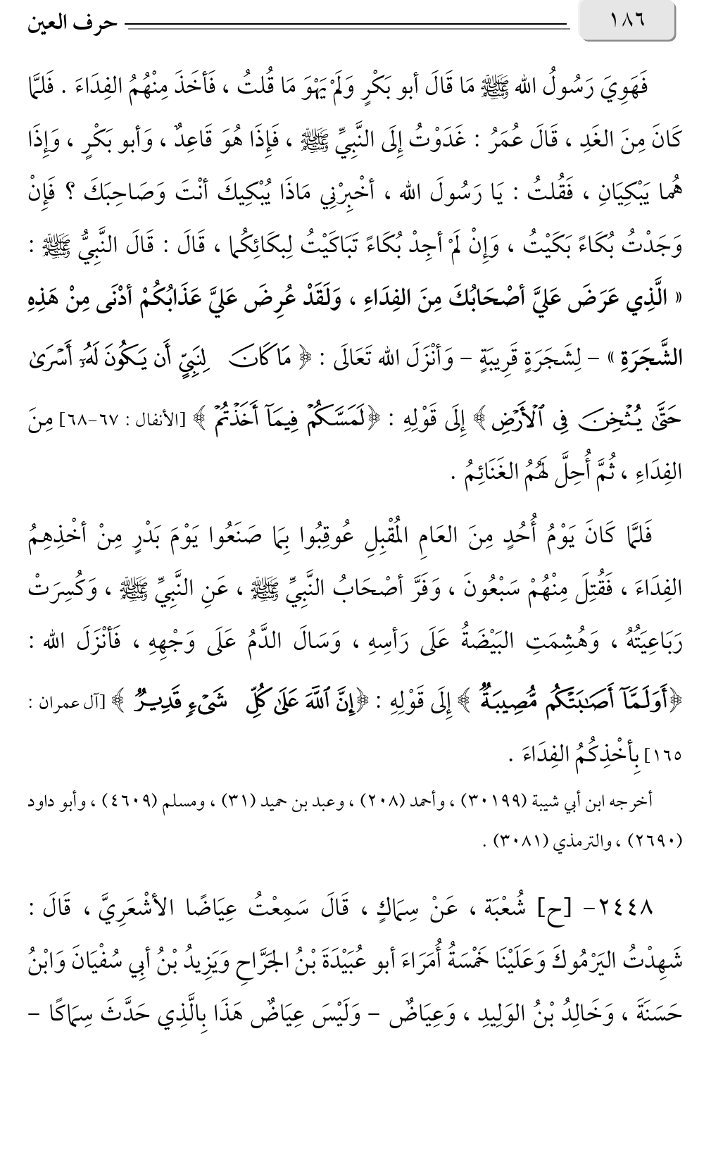 فَهَوِيَ رَسُولُ الله صلى الله عليه وسلم مَا قَالَ أبو بَكْرٍ وَلَمْ يَهْوَ مَا قُلتُ، فَأخَذَ مِنْهُمُ الفِدَاءَ. فَلمَّا كَانَ مِنَ الغَدِ، قَالَ عُمَرُ: غَدَوْتُ إِلَى النَّبِيِّ صلى الله عليه وسلم، فَإِذَا هُوَ قَاعِدٌ، وَأبو بَكْرٍ، وَإِذَا هُما يَبْكِيَانِ، فَقُلتُ: يَا رَسُولَ الله، أخْبِرْنِي مَاذَا يُبْكِيكَ أنْتَ وَصَاحِبَكَ؟ فَإِنْ وَجَدْتُ بُكَاءً بَكَيْتُ، وَإِنْ لَمْ أجِدْ بُكَاءً تَبَاكَيْتُ لِبكَائِكُما، قَالَ: قَالَ النَّبِيُّ صلى الله عليه وسلم: «الَّذِي عَرَضَ عَليَّ أصْحَابُكَ مِنَ الفِدَاءِ، وَلَقَدْ عُرِضَ عَليَّ عَذَابُكُمْ أدْنَى مِنْ هَذِهِ الشَّجَرَةِ».: لِشَجَرَةٍ قَرِيبَةٍ - وَأنْزَلَ الله تَعَالَى: {مَا كَانَ لِنَبِيٍّ أَنْ يَكُونَ لَهُ أَسْرَى حَتَّى يُثْخِنَ فِي الْأَرْضِ} إِلَى قَوْلِهِ {لَمَسَّكُمْ فِيمَا أَخَذْتُمْ} [الأنفال: ٦٧ - ٦٨] مِنَ الفِدَاءِ، ثُمَّ أُحِلَّ لَهُمُ الغَنَائِمُ.