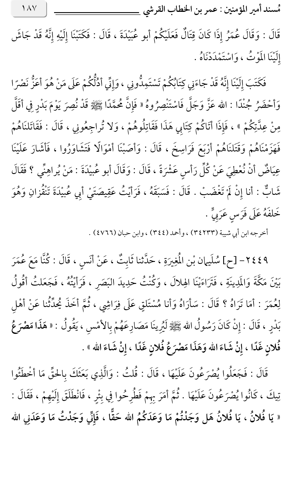 ٢٤٤٩ - [ح] سُلَيمان بْن المُغِيرَةِ، حَدَّثنا ثَابِتٌ، عَنْ أنَسٍ، قَالَ: كُنَّا مَعَ عُمَرَ بَيْنَ مَكَّةَ وَالمَدِينَةِ، فَتَرَاءَيْنَا الهِلالَ، وَكُنْتُ حَدِيدَ البَصَرِ، فَرَأيْتُهُ، فَجَعَلتُ أقُولُ لِعُمَرَ: أمَا تَرَاهُ؟ قَالَ: سَأرَاهُ وَأنا مُسْتَلقٍ عَلَى فِرَاشِي، ثُمَّ أخَذَ يُحدِّثُنا عَنْ أهْلِ بَدْرٍ، قَالَ: إِنْ كَانَ رَسُولُ الله صلى الله عليه وسلم لَيُرِينَا مَصَارِعَهُمْ بِالأمْسِ، يَقُولُ: «هَذَا مَصْرَعُ فُلانٍ غَدًا، إِنْ شَاءَ الله وَهَذَا مَصْرَعُ فُلانٍ غَدًا، إِنْ شَاءَ الله».