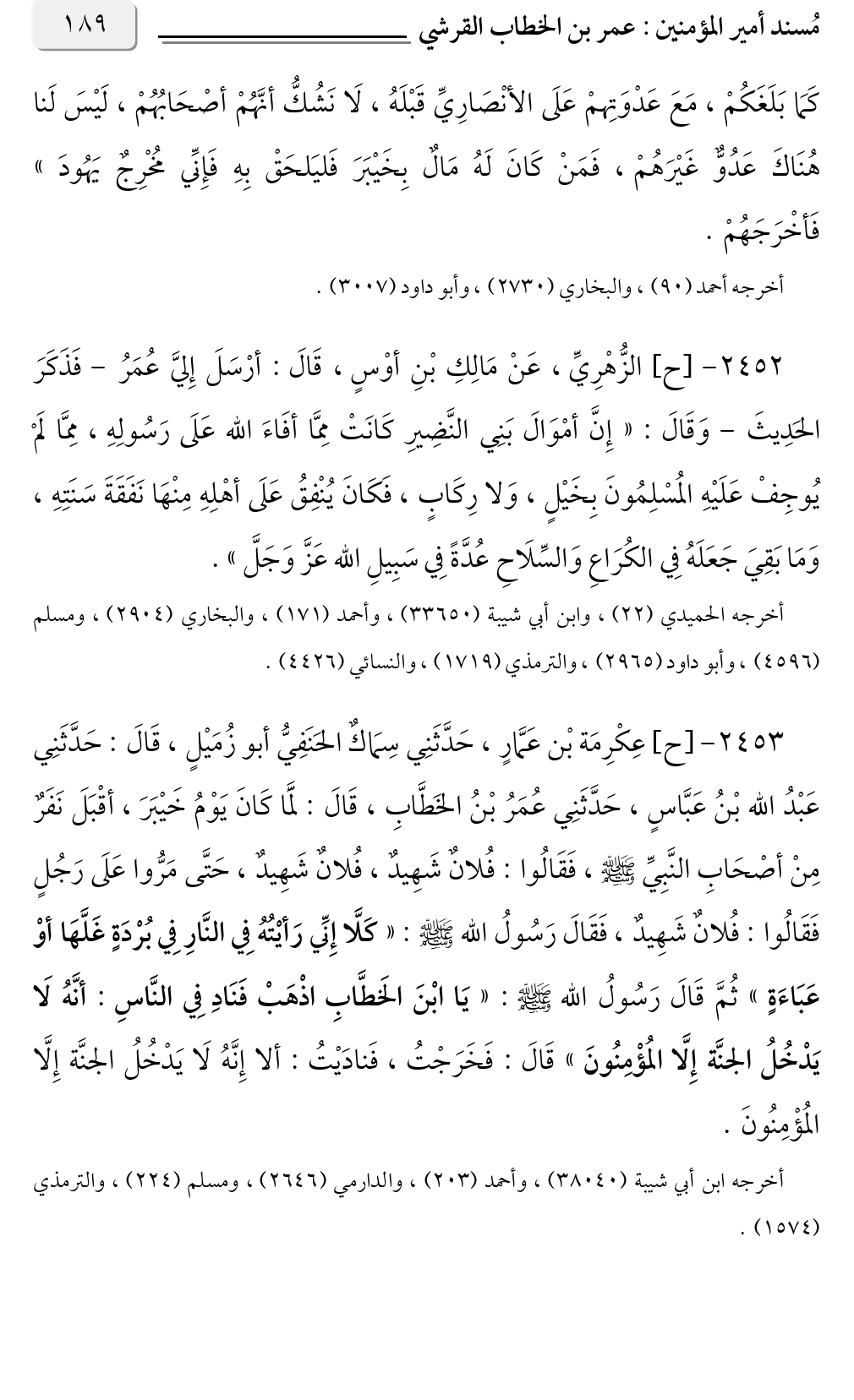 ٢٤٥٣ - [ح] عِكْرِمَة بْن عَمَّارٍ، حَدَّثَنِي سِمَاكٌ الحَنَفِيُّ أبو زُمَيْلٍ، قَالَ: حَدَّثَنِي عَبْدُ الله بْنُ عَبَّاسٍ، حَدَّثَنِي عُمَرُ بْنُ الخَطَّابِ، قَالَ: لَمَّا كَانَ يَوْمُ خَيْبَرَ، أقْبَلَ نَفَرٌ مِنْ أصْحَابِ النَّبِيِّ صلى الله عليه وسلم، فَقَالُوا: فُلانٌ شَهِيدٌ، فُلانٌ شَهِيدٌ، حَتَّى مَرُّوا عَلَى رَجُلٍ فَقَالُوا: فُلانٌ شَهِيدٌ، فَقَالَ رَسُولُ الله صلى الله عليه وسلم: «كَلَّا إِنِّي رَأيْتُهُ فِي النَّارِ فِي بُرْدَةٍ غَلَّهَا أوْ عَبَاءَةٍ» ثُمَّ قَالَ رَسُولُ الله صلى الله عليه وسلم: «يَا ابْنَ الخَطَّابِ اذْهَبْ فَنَادِ فِي النَّاسِ: أنَّهُ لَا يَدْخُلُ الجنَّة إِلَّا المُؤْمِنُونَ» قَالَ: فَخَرَجْتُ، فَنادَيْتُ: ألا إِنَّهُ لَا يَدْخُلُ الجنَّة إِلَّا المُؤْمِنُونَ.