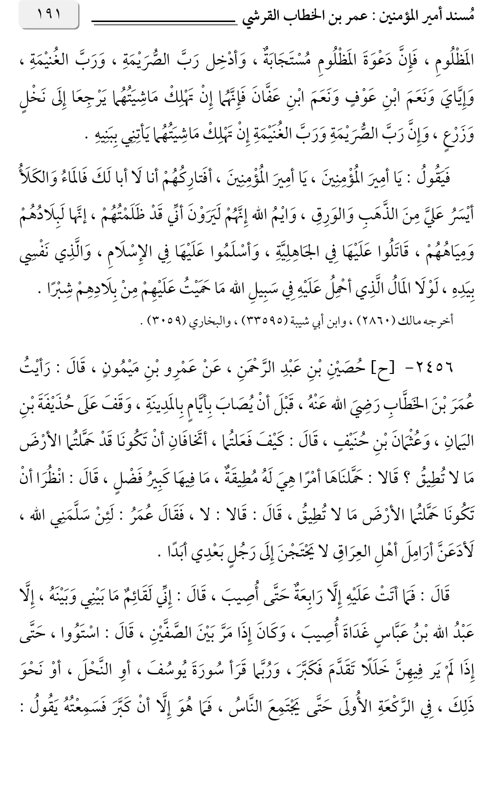 ٢٤٥٦ - [ح] حُصَيْنِ بْنِ عَبْدِ الرَّحْمَنِ، عَنْ عَمْرِو بْنِ مَيْمُونٍ، قَالَ: رَأيْتُ عُمَرَ بْنَ الخَطَّابِ رَضِيَ الله عَنْهُ، قَبْلَ أنْ يُصَابَ بِأيَّامٍ بِالمَدِينَةِ، وَقَفَ عَلَى حُذَيْفَةَ بْنِ اليَمانِ، وَعُثْمَانَ بْنِ حُنَيْفٍ، قَالَ: كَيْفَ فَعَلتُما، أتَخافَانِ أنْ تَكُونَا قَدْ حَمَّلتُما الأرْضَ مَا لا تُطِيقُ؟ قَالا: حَمَّلنَاهَا أمْرًا هِيَ لَهُ مُطِيقَةٌ، مَا فِيهَا كَبِيرُ فَضْلٍ، قَالَ: انْظُرَا أنْ تَكُونَا حَمَّلتُما الأرْضَ مَا لا تُطِيقُ، قَالَ: قَالا: لا، فَقَالَ عُمَرُ: لَئِنْ سَلَّمَنِي الله، لَأدَعَنَّ أرَامِلَ أهْلِ العِرَاقِ لا يَحْتَجْنَ إِلَى رَجُلٍ بَعْدِي أبَدًا.
