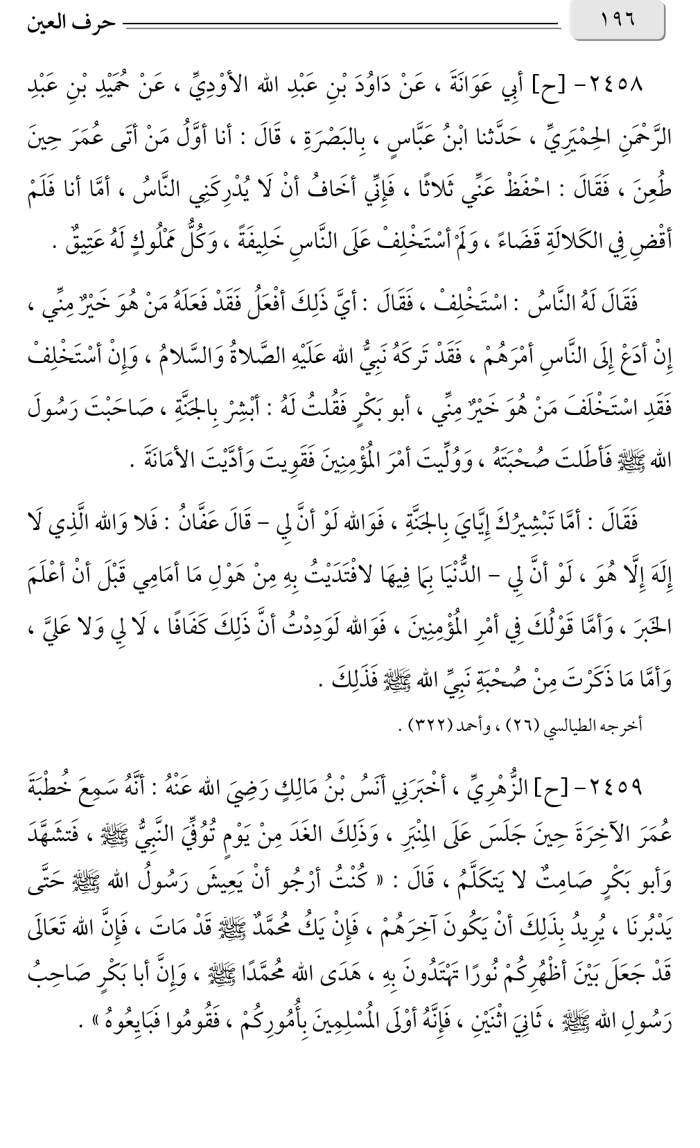 ٢٤٥٩ - [ح] الزُّهْرِيِّ، أخْبَرَنِي أنَسُ بْنُ مَالِكٍ رَضِيَ الله عَنْهُ: أنَّهُ سَمِعَ خُطْبَةَ عُمَرَ الآخِرَةَ حِينَ جَلَسَ عَلَى المِنْبَرِ، وَذَلِكَ الغَدَ مِنْ يَوْمٍ تُوُفِّيَ النَّبِيُّ صلى الله عليه وسلم، فَتشَهَّدَ وَأبو بَكْرٍ صَامِتٌ لا يَتكَلَّمُ، قَالَ: «كُنْتُ أرْجُو أنْ يَعِيشَ رَسُولُ الله صلى الله عليه وسلم حَتَّى يَدْبُرنَا، يُرِيدُ بِذَلِكَ أنْ يَكُونَ آخِرَهُمْ، فَإِنْ يَكُ مُحمَّدٌ صلى الله عليه وسلم قَدْ مَاتَ، فَإِنَّ الله تَعَالَى قَدْ جَعَلَ بَيْنَ أظْهُرِكُمْ نُورًا تَهْتَدُونَ بِهِ، هَدَى الله مُحمَّدًا صلى الله عليه وسلم، وَإِنَّ أبا بَكْرٍ صَاحِبُ رَسُولِ الله صلى الله عليه وسلم، ثَانِيَ اثْنَيْنِ، فَإِنَّهُ أوْلَى المُسْلِمِينَ بِأُمُورِكُمْ، فَقُومُوا فَبَايِعُوهُ».