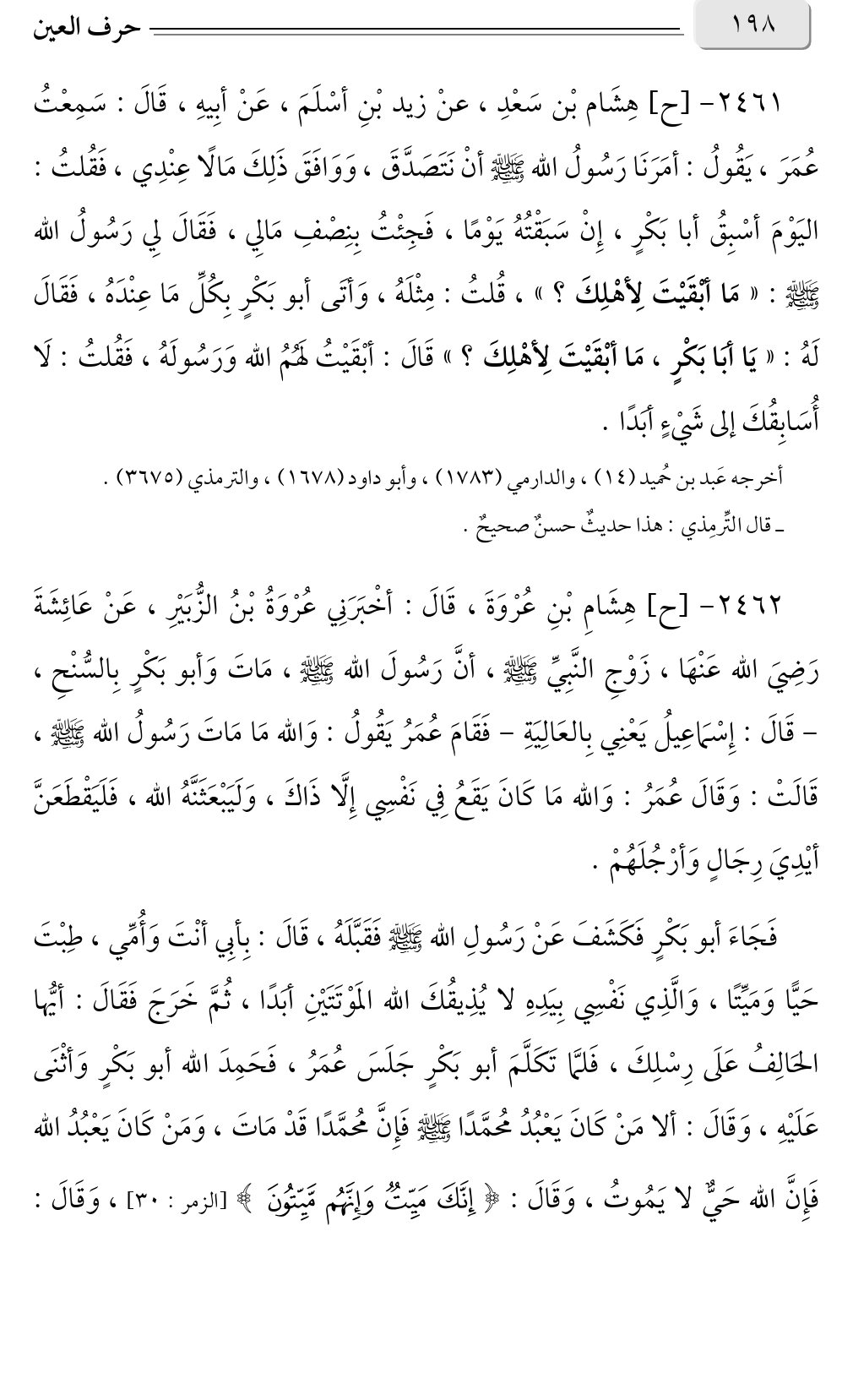 ٢٤٦٢ - [ح] هِشَامِ بْنِ عُرْوَةَ، قَالَ: أخْبَرَنِي عُرْوَةُ بْنُ الزُّبَيْرِ، عَنْ عَائِشَةَ رَضِيَ الله عَنْهَا، زَوْجِ النَّبِيِّ صلى الله عليه وسلم، أنَّ رَسُولَ الله صلى الله عليه وسلم، مَاتَ وَأبو بَكْرٍ بِالسُّنْحِ، - قَالَ: إِسْمَاعِيلُ يَعْنِي بِالعَالِيَةِ - فَقَامَ عُمَرُ يَقُولُ: وَالله مَا مَاتَ رَسُولُ الله صلى الله عليه وسلم، قَالَتْ: وَقَالَ عُمَرُ: وَالله مَا كَانَ يَقَعُ فِي نَفْسِي إِلَّا ذَاكَ، وَلَيَبْعَثَنَّهُ الله، فَلَيَقْطَعَنَّ أيْدِيَ رِجَالٍ وَأرْجُلَهُمْ.