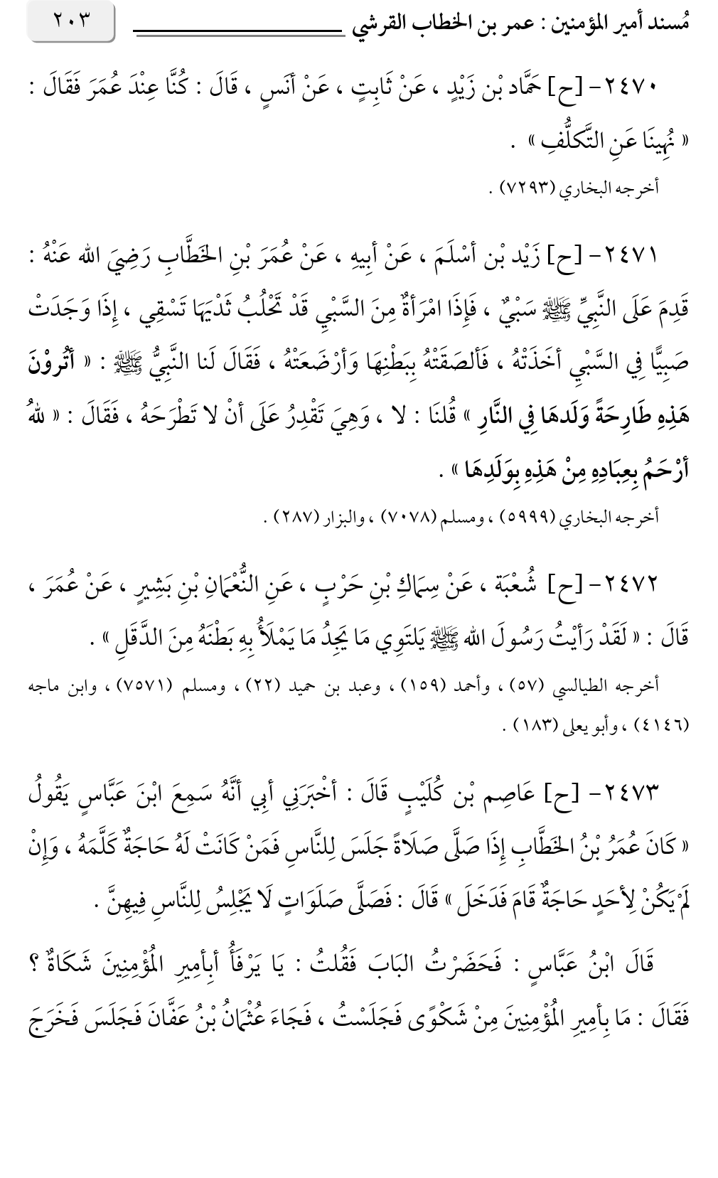 ٢٤٧٠ - [ح] حَمَّاد بْن زَيْدٍ، عَنْ ثَابِتٍ، عَنْ أنَسٍ، قَالَ: كُنَّا عِنْدَ عُمَرَ فَقَالَ: «نُهِينَا عَنِ التَّكلُّفِ».