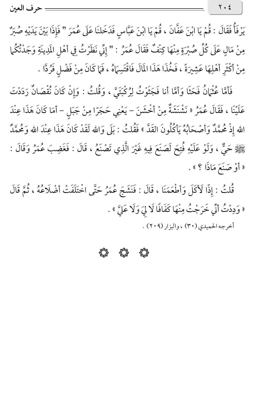 فَأمَّا عُثْمَانُ فَحَثَا وَأمَّا أنا فَجَثَوْتُ لِرُكْبَتَيَّ، وَقُلتُ: وَإِنْ كَانَ نُقْصَانٌ رَدَدْتَ عَلَيْنَا، فَقَالَ عُمَرُ «نَشْنَشَةٌ مِنْ أخْشَنَ - يَعْنِي حَجَرًا مِنْ جَبَلٍ - أمَا كَانَ هَذَا عِنْدَ الله إِذْ مُحمَّدٌ وَأصْحَابُهُ يَأكُلُونَ القَدَّ» فَقُلتُ: بَلَى وَالله لَقَدْ كَانَ هَذَا عِنْدَ الله وَمُحمَّدٌ صلى الله عليه وسلم حَيٌّ، وَلَوْ عَلَيْهِ فُتِحَ لَصَنَعَ فِيهِ غَيْرَ الَّذِي تَصْنَعُ، قَالَ: فَغَضِبَ عُمَرُ وَقَالَ: «أوْ صَنَعَ مَاذَا؟ ».