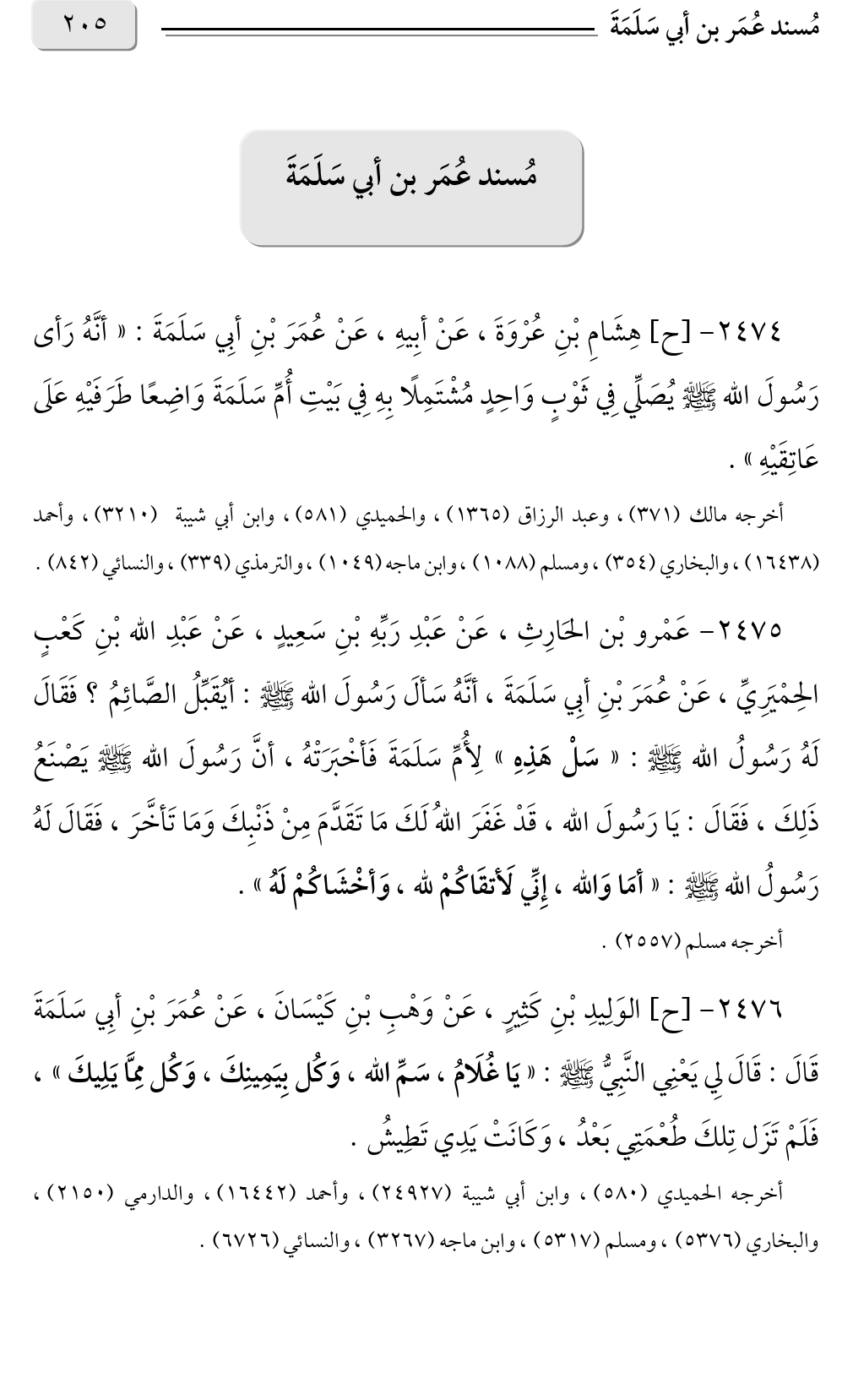 ٢٤٧٤ - [ح] هِشَامِ بْنِ عُرْوَةَ، عَنْ أبِيهِ، عَنْ عُمَرَ بْنِ أبِي سَلَمَةَ: «أنَّهُ رَأى رَسُولَ الله صلى الله عليه وسلم يُصَلِّي فِي ثَوْبٍ وَاحِدٍ مُشْتَمِلًا بِهِ فِي بَيْتِ أُمِّ سَلَمَةَ وَاضِعًا طَرَفَيْهِ عَلَى عَاتِقَيْهِ».