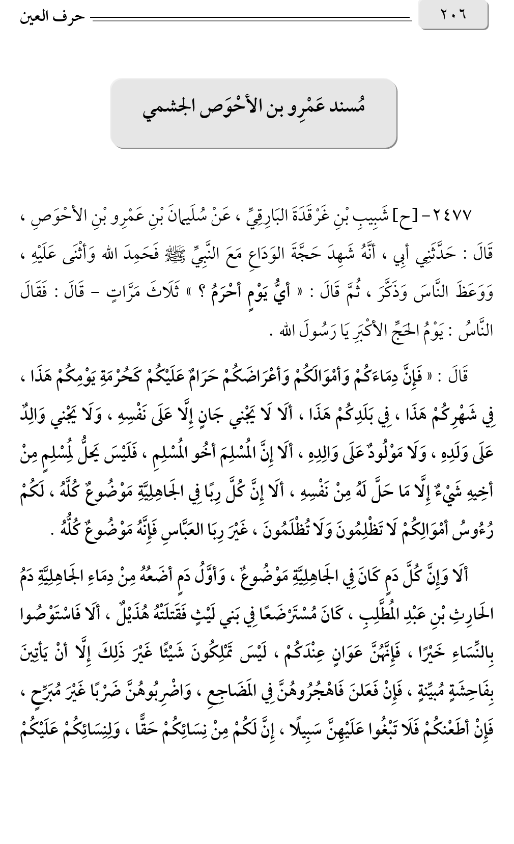 ٢٤٧٧ - [ح] شَبِيبِ بْنِ غَرْقَدَةَ البَارِقِيِّ، عَنْ سُلَيمانَ بْنِ عَمْرِو بْنِ الأحْوَصِ، قَالَ: حَدَّثَنِي أبِي، أنَّهُ شَهِدَ حَجَّةَ الوَدَاعِ مَعَ النَّبِيِّ صلى الله عليه وسلم فَحَمِدَ الله وَأثْنَى عَلَيْهِ، وَوَعَظَ النَّاسَ وَذَكَّرَ، ثُمَّ قَالَ: «أيُّ يَوْمٍ أحْرَمُ؟ » ثَلَاثَ مَرَّاتٍ - قَالَ: فَقَالَ النَّاسُ: يَوْمُ الحَجِّ الأكْبَرِ يَا رَسُولَ الله.