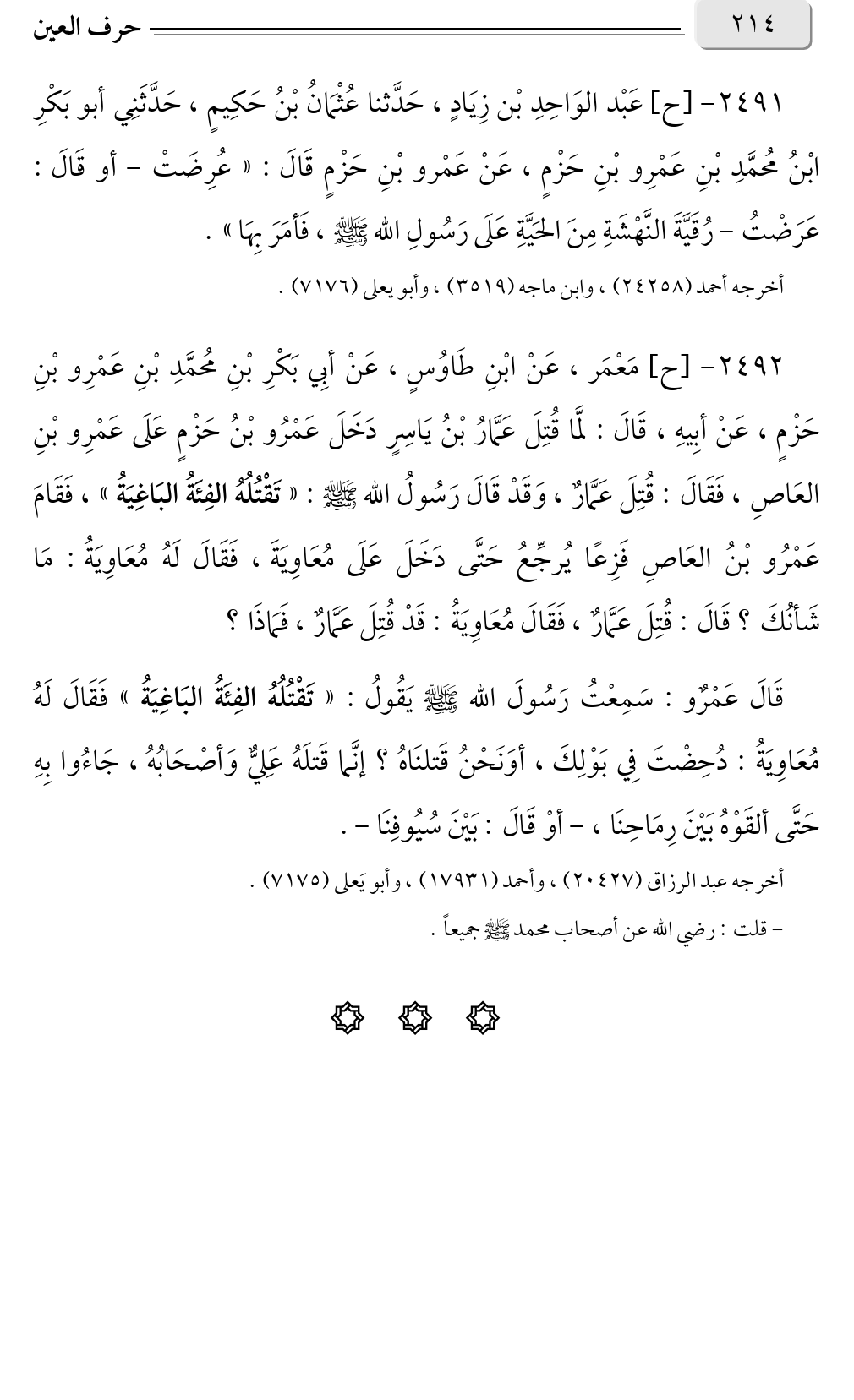 ٢٤٩٢ - [ح] مَعْمَر، عَنْ ابْنِ طَاوُسٍ، عَنْ أبِي بَكْرِ بْنِ مُحمَّدِ بْنِ عَمْرِو بْنِ حَزْمٍ، عَنْ أبِيهِ، قَالَ: لمَّا قُتِلَ عَمَّارُ بْنُ يَاسِرٍ دَخَلَ عَمْرُو بْنُ حَزْمٍ عَلَى عَمْرِو بْنِ العَاصِ، فَقَالَ: قُتِلَ عَمَّارٌ، وَقَدْ قَالَ رَسُولُ الله صلى الله عليه وسلم: «تَقْتُلُهُ الفِئَةُ البَاغِيَةُ» فَقَامَ، عَمْرُو بْنُ العَاصِ فَزِعًا يُرجِّعُ حَتَّى دَخَلَ عَلَى مُعَاوِيَةَ، فَقَالَ لَهُ مُعَاوِيَةُ: مَا شَأنُكَ؟ قَالَ: قُتِلَ عَمَّارٌ، فَقَالَ مُعَاوِيَةُ: قَدْ قُتِلَ عَمَّارٌ، فَمَاذَا؟