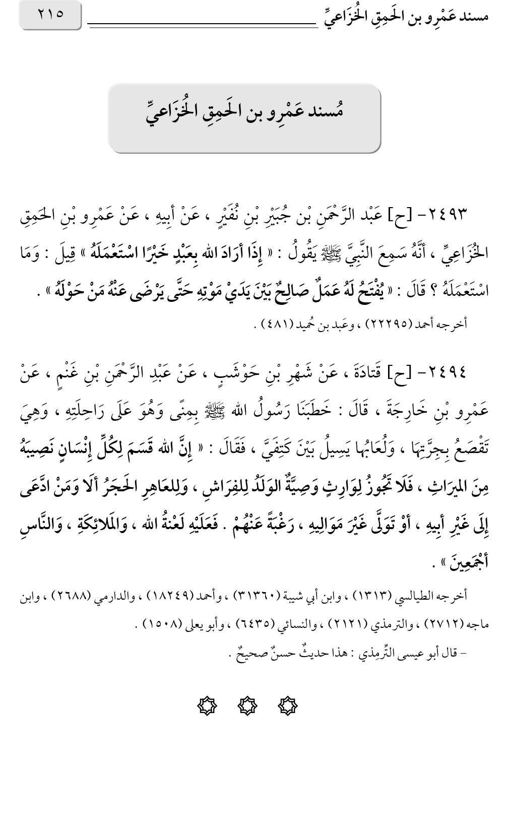 ٢٤٩٣ - [ح] عَبْد الرَّحْمَنِ بْن جُبَيْرِ بْنِ نُفَيْرٍ، عَنْ أبِيهِ، عَنْ عَمْرِو بْنِ الحَمِقِ الخُزَاعِيِّ، أنَّهُ سَمِعَ النَّبِيَّ صلى الله عليه وسلم يَقُولُ: «إِذَا أرَادَ الله بِعَبْدٍ خَيْرًا اسْتَعْمَلَهُ» قِيلَ: وَمَا اسْتَعْمَلَهُ؟ قَالَ: «يُفْتَحُ لَهُ عَمَلٌ صَالِحٌ بَيْنَ يَدَيْ مَوْتِهِ حَتَّى يَرْضَى عَنْهُ مَنْ حَوْلَهُ».