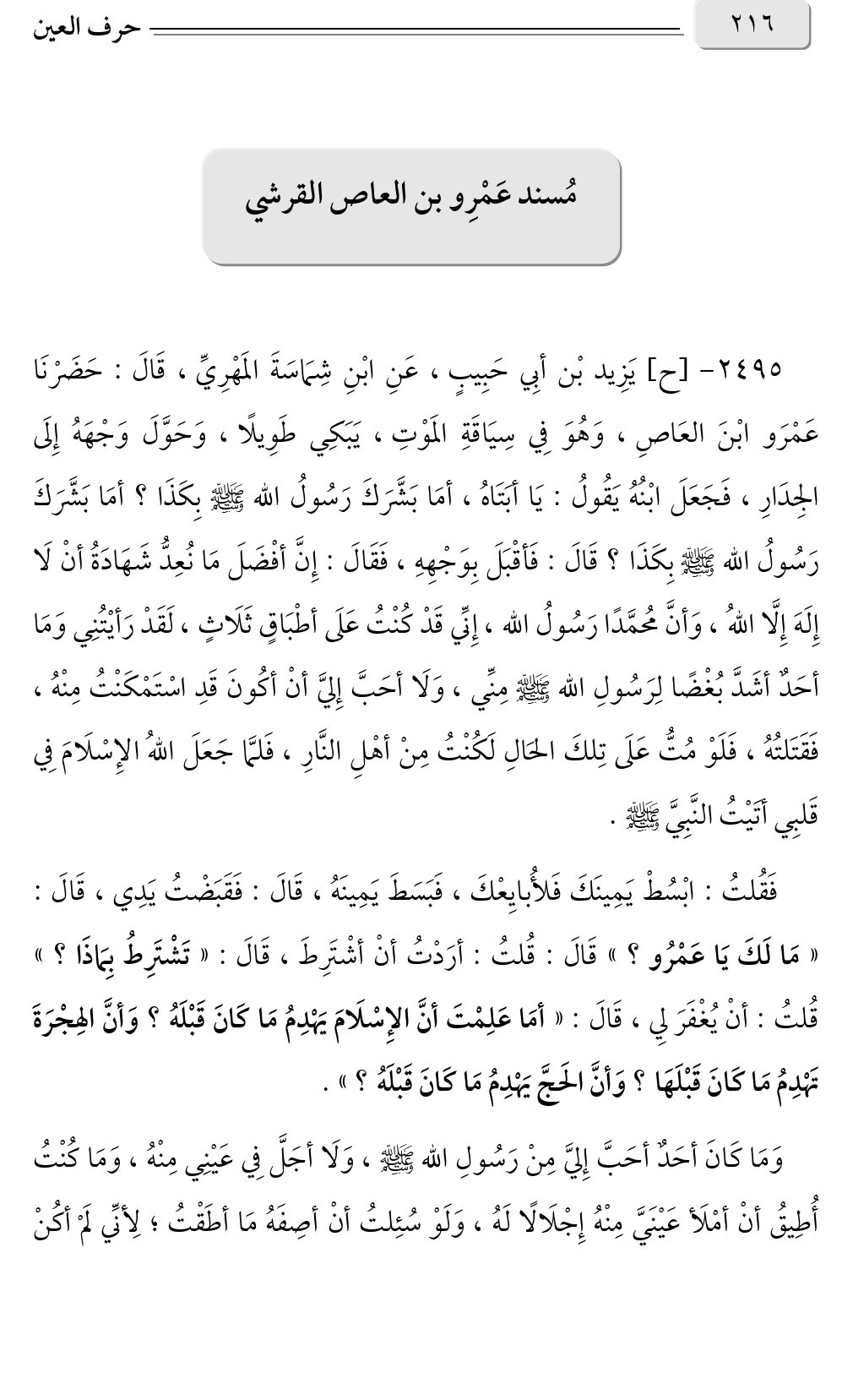 ٢٤٩٥ - [ح] يَزِيد بْن أبِي حَبِيبٍ، عَنِ ابْنِ شِمَاسَةَ المَهْرِيِّ، قَالَ: حَضَرْنَا عَمْرَو ابْنَ العَاصِ، وَهُوَ فِي سِيَاقَةِ المَوْتِ، يَبَكِي طَوِيلًا، وَحَوَّلَ وَجْهَهُ إِلَى الجِدَارِ، فَجَعَلَ ابْنُهُ يَقُولُ: يَا أبَتَاهُ، أمَا بَشَّرَكَ رَسُولُ الله صلى الله عليه وسلم بِكَذَا؟ أمَا بَشَّرَكَ رَسُولُ الله صلى الله عليه وسلم بِكَذَا؟ قَالَ: فَأقْبَلَ بِوَجْهِهِ، فَقَالَ: إِنَّ أفْضَلَ مَا نُعِدُّ شَهَادَةُ أنْ لَا إِلَهَ إِلَّا اللهُ، وَأنَّ مُحمَّدًا رَسُولُ الله، إِنِّي قَدْ كُنْتُ عَلَى أطْبَاقٍ ثَلَاثٍ، لَقَدْ رَأيْتُنِي وَمَا أحَدٌ أشَدَّ بُغْضًا لِرَسُولِ الله صلى الله عليه وسلم مِنِّي، وَلَا أحَبَّ إِليَّ أنْ أكُونَ قَدِ اسْتَمْكَنْتُ مِنْهُ، فَقَتَلتُهُ، فَلَوْ مُتُّ عَلَى تِلكَ الحَالِ لَكُنْتُ مِنْ أهْلِ النَّارِ، فَلمَّا جَعَلَ اللهُ الإِسْلَامَ فِي قَلبِي أتَيْتُ النَّبِيَّ صلى الله عليه وسلم.