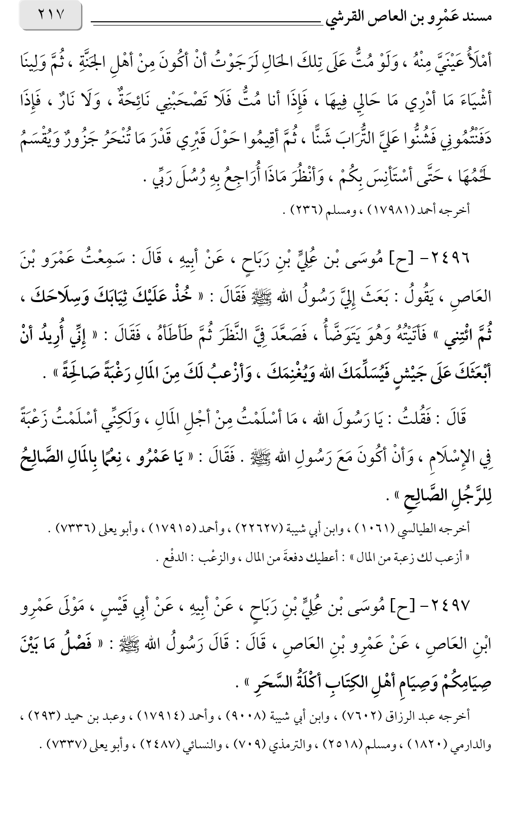 ٢٤٩٦ - [ح] مُوسَى بْن عُلِيٍّ بْنِ رَبَاحٍ، عَنْ أبِيهِ، قَالَ: سَمِعْتُ عَمْرَو بْنَ العَاصِ، يَقُولُ: بَعَثَ إِليَّ رَسُولُ الله صلى الله عليه وسلم فَقَالَ: «خُذْ عَلَيْكَ ثِيَابَكَ وَسِلَاحَكَ، ثُمَّ ائْتِني» فَأتَيْتُهُ وَهُوَ يَتَوَضَّأُ، فَصَعَّدَ فِيَّ النَّظَرَ ثُمَّ طَأطَأهُ، فَقَالَ: «إِنِّي أُرِيدُ أنْ أبْعَثَكَ عَلَى جَيْشٍ فَيُسَلِّمَكَ الله وَيُغْنِمَكَ، وَأزْعبُ لَكَ مِنَ المَالِ رَغْبَةً صَالحَةً». قَالَ: فَقُلتُ: يَا رَسُولَ الله، مَا أسْلَمْتُ مِنْ أجْلِ المَالِ، وَلَكِنِّي أسْلَمْتُ زَعْبَةً فِي الإِسْلَامِ، وَأنْ أكُونَ مَعَ رَسُولِ الله صلى الله عليه وسلم. فَقَالَ: «يَا عَمْرُو، نِعْمًا بِالمَالِ الصَّالِحُ لِلرَّجُلِ الصَّالِحِ».