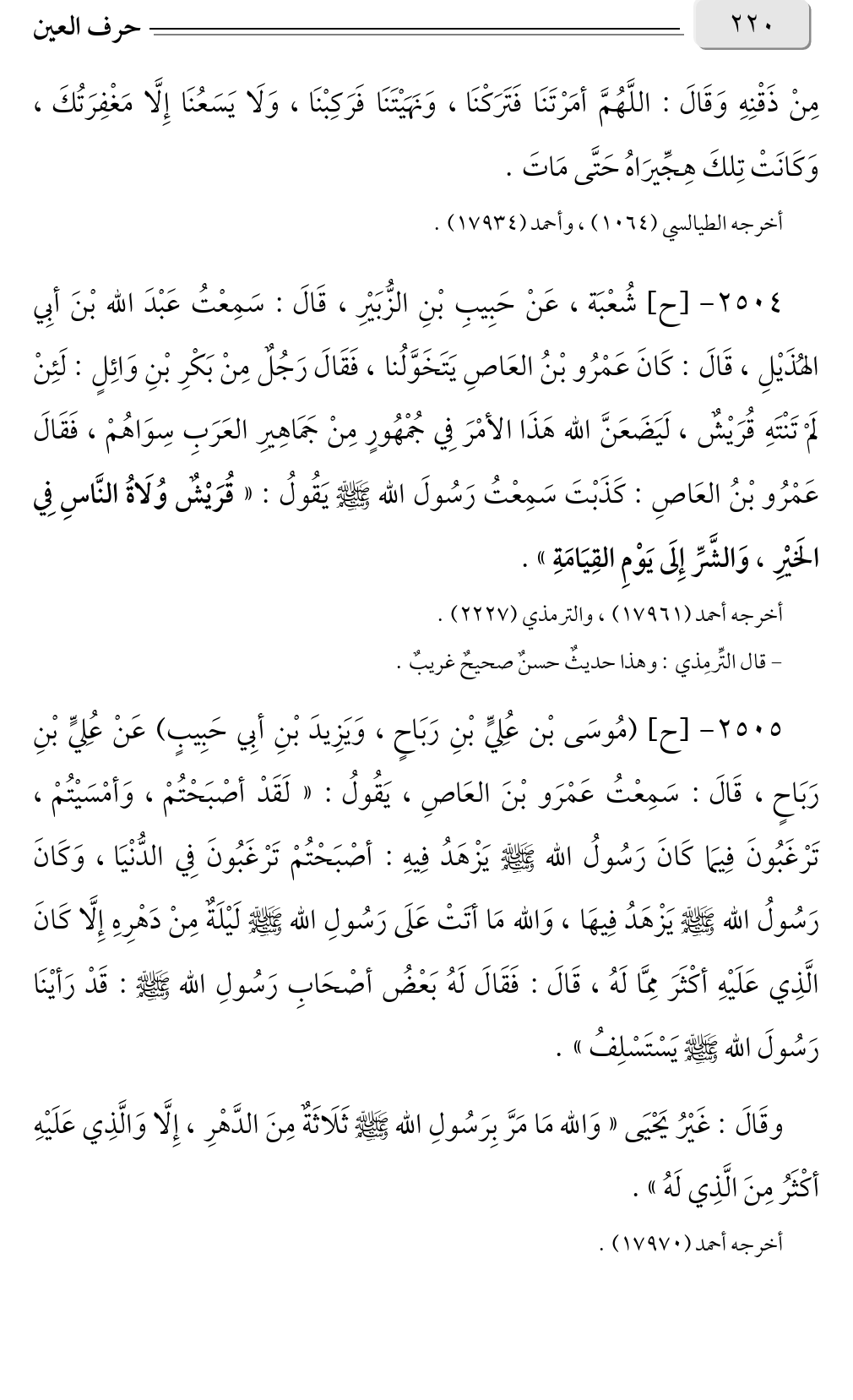 ٢٥٠٤ - [ح] شُعْبَة، عَنْ حَبِيبِ بْنِ الزُّبَيْرِ، قَالَ: سَمِعْتُ عَبْدَ الله بْنَ أبِي الهُذَيْلِ، قَالَ: كَانَ عَمْرُو بْنُ العَاصِ يَتَخَوَّلُنا، فَقَالَ رَجُلٌ مِنْ بَكْرِ بْنِ وَائِلٍ: لَئِنْ لَمْ تَنْتَهِ قُرَيْشٌ، لَيَضَعَنَّ الله هَذَا الأمْرَ فِي جُمْهُورٍ مِنْ جَمَاهِيرِ العَرَبِ سِوَاهُمْ، فَقَالَ عَمْرُو بْنُ العَاصِ: كَذَبْتَ سَمِعْتُ رَسُولَ الله صلى الله عليه وسلم يَقُولُ: «قُرَيْشٌ وُلَاةُ النَّاسِ فِي الخَيْرِ، وَالشَّرِّ إِلَى يَوْمِ القِيَامَةِ».