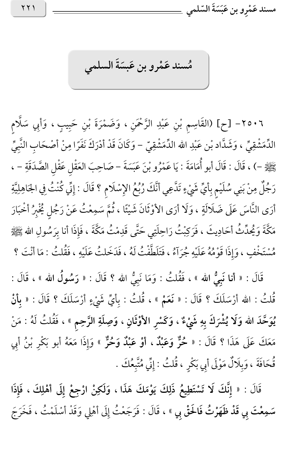 ٢٥٠٦ - [ح] (القَاسِمِ بْنِ عَبْدِ الرَّحْمَنِ، وَضَمْرَةَ بْنِ حَبِيبٍ، وَأبِي سَلَّامٍ الدِّمَشْقِيِّ، وَشَدَّاد بْن عَبْدِ الله الدِّمَشْقِيّ - وَكَانَ قَدْ أدْرَكَ نَفَرًا مِنْ أصْحَابِ النَّبِيِّ صلى الله عليه وسلم -)، قَالَ: قَالَ أبو أُمَامَةَ: يَا عَمْرُو بْنَ عَبَسَةَ - صَاحِبَ العَقْلِ عَقْلِ الصَّدَقَةِ -، رَجُلٌ مِنْ بَنِي سُلَيْمٍ بِأيِّ شَيْءٍ تَدَّعِي أنَّكَ رُبُعُ الإِسْلَامِ؟ قَالَ: إِنِّي كُنْتُ فِي الجَاهِلِيَّةِ أرَى النَّاسَ عَلَى ضَلَالَةٍ، وَلَا أرَى الأوْثَانَ شَيْئًا، ثُمَّ سَمِعْتُ عَنْ رَجُلٍ يُخْبِرُ أخْبَارَ مَكَّةَ وَيُحدِّثُ أحَادِيثَ، فَرَكِبْتُ رَاحِلَتِي حَتَّى قَدِمْتُ مَكَّةَ، فَإِذَا أنا بِرَسُولِ الله صلى الله عليه وسلم مُسْتَخْفٍ، وَإِذَا قَوْمُهُ عَلَيْهِ جُرَآءُ، فَتَلَطَّفْتُ لَهُ، فَدَخَلتُ عَلَيْهِ، فَقُلتُ: مَا أنْتَ؟ قَالَ: «أنا نَبِيُّ الله» فَقُلتُ: وَمَا نَبِيُّ الله؟ قَالَ: «رَسُولُ الله» قَالَ: قُلتُ: الله أرْسَلَكَ؟ قَالَ: «نَعَمْ» قُلتُ: بِأيِّ شَيْءٍ أرْسَلَكَ؟ قَالَ: «بِأنْ يُوَحَّدَ الله وَلَا يُشْرَكَ بِهِ شَيْءٌ، وَكَسْرِ الأوْثَانِ، وَصِلَةِ الرَّحِمِ» فَقُلتُ لَهُ: مَنْ، مَعَكَ عَلَى هَذَا؟ قَالَ: «حُرٌّ وَعَبْدٌ، أوْ عَبْدٌ وَحُرٌّ» وَإِذَا مَعَهُ أبو بَكْرِ بْنُ أبِي قُحَافَةَ، وَبِلَالٌ مَوْلَى أبِي بَكْرٍ، قُلتُ: إِنِّي مُتَّبِعُكَ.