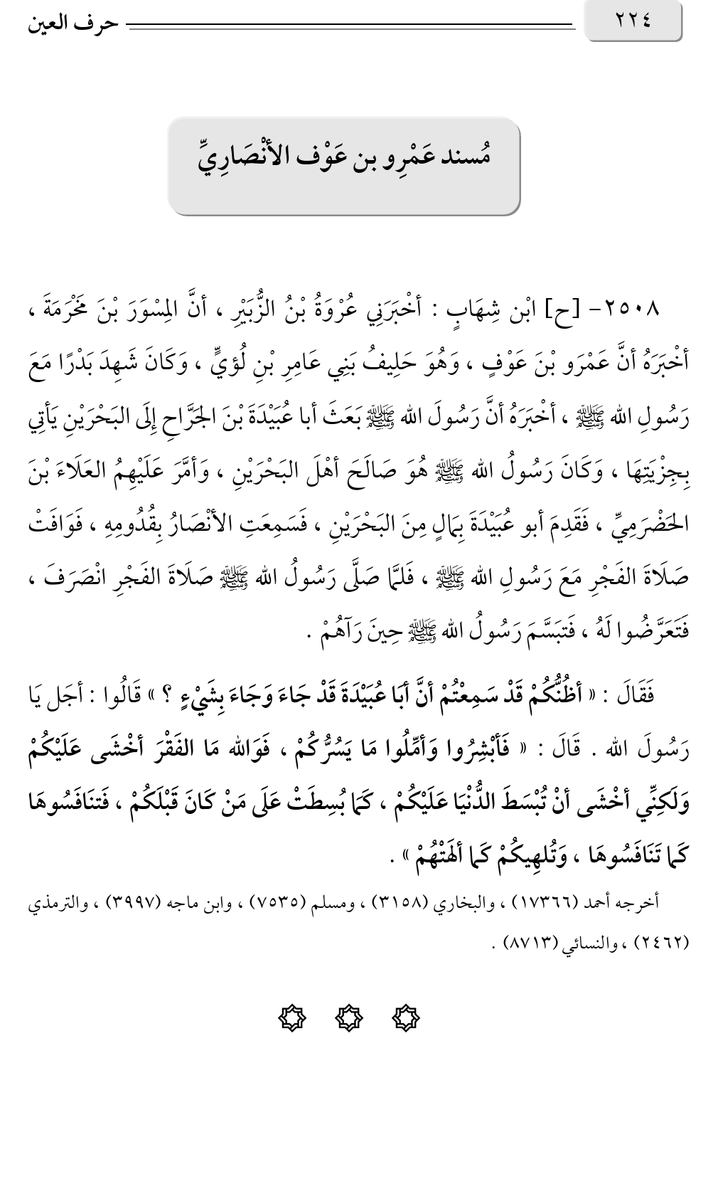 فَقَالَ: «أظُنُّكُمْ قَدْ سَمِعْتُمْ أنَّ أبَا عُبَيْدَةَ قَدْ جَاءَ وَجَاءَ بِشَيْءٍ؟ » قَالُوا: أجَل يَا رَسُولَ الله. قَالَ: «فَأبْشِرُوا وَأمِّلُوا مَا يَسُرُّكُمْ، فَوَالله مَا الفَقْرَ أخْشَى عَلَيْكُمْ وَلَكِنِّي أخْشَى أنْ تُبْسَطَ الدُّنْيَا عَلَيْكُمْ، كَمَا بُسِطَتْ عَلَى مَنْ كَانَ قَبْلَكُمْ، فَتنَافَسُوهَا كَما تَنَافَسُوهَا، وَتُلهِيكُمْ كَما ألَهتْهُمْ».