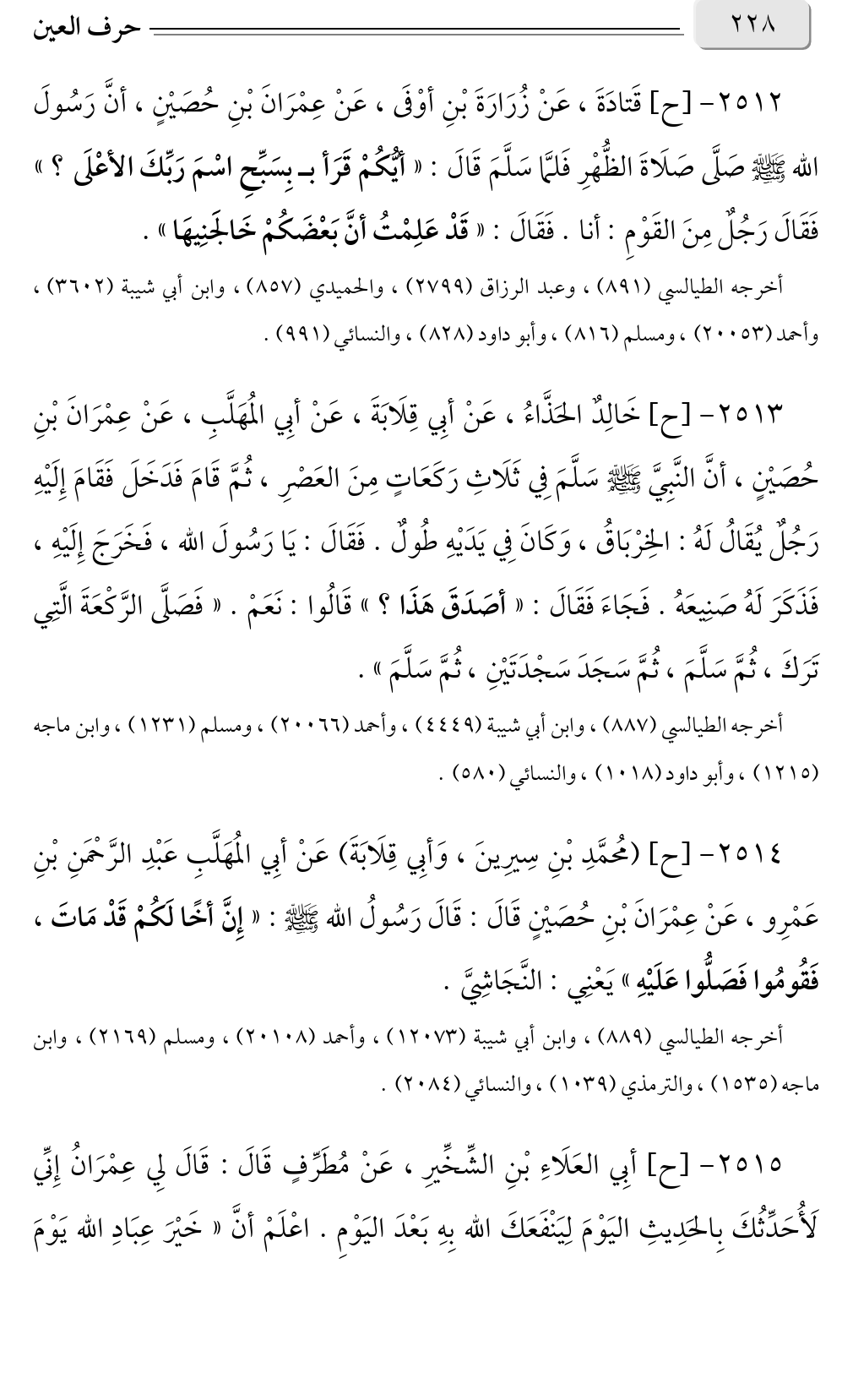 ٢٥١٢ - [ح] قَتادَةَ، عَنْ زُرَارَةَ بْنِ أوْفَى، عَنْ عِمْرَانَ بْنِ حُصَيْنٍ، أنَّ رَسُولَ الله صلى الله عليه وسلم صَلَّى صَلَاةَ الظُّهْرِ فَلمَّا سَلَّمَ قَالَ: «أيُّكُمْ قَرَأ ب بِسَبِّحِ اسْمَ رَبِّكَ الأعْلَى؟ » فَقَالَ رَجُلٌ مِنَ القَوْمِ: أنا. فَقَالَ: «قَدْ عَلِمْتُ أنَّ بَعْضَكُمْ خَالجَنِيهَا».