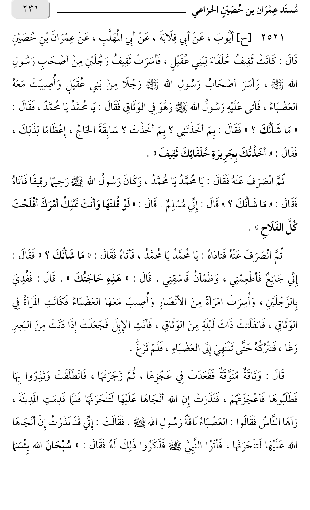 ٢٥٢١ - [ح] أيُّوبَ، عَنْ أبِي قِلَابَةَ، عَنْ أبِي المُهَلَّبِ، عَنْ عِمْرَانَ بْنِ حُصَيْنٍ قَالَ: كَانَتْ ثَقِيفُ حُلَفَاءَ لِبَنِي عُقَيْلٍ، فَأسَرَتْ ثَقِيفُ رَجُلَيْنِ مِنْ أصْحَابِ رَسُولِ الله صلى الله عليه وسلم، وَأسَرَ أصْحَابُ رَسُولِ الله صلى الله عليه وسلم رَجُلًا مِنْ بَنِي عُقَيْلٍ وَأُصِيبَتْ مَعَهُ العَضْبَاءُ، فَأتى عَلَيْهِ رَسُولُ الله صلى الله عليه وسلم وَهُوَ فِي الوَثَاقِ فَقَالَ: يَا مُحمَّدُ يَا مُحمَّدُ، فَقَالَ: «مَا شَأنُكَ» فَقَالَ: بِمَ أخَذْتَنِي؟ بِمَ أخَذْتَ؟ سَابِقَةَ الحَاجِّ، إِعْظَامًا لِذَلِكَ، فَقَالَ: «أخَذْتُكَ بِجَرِيرَةِ حُلَفَائِكَ ثَقِيفَ».
