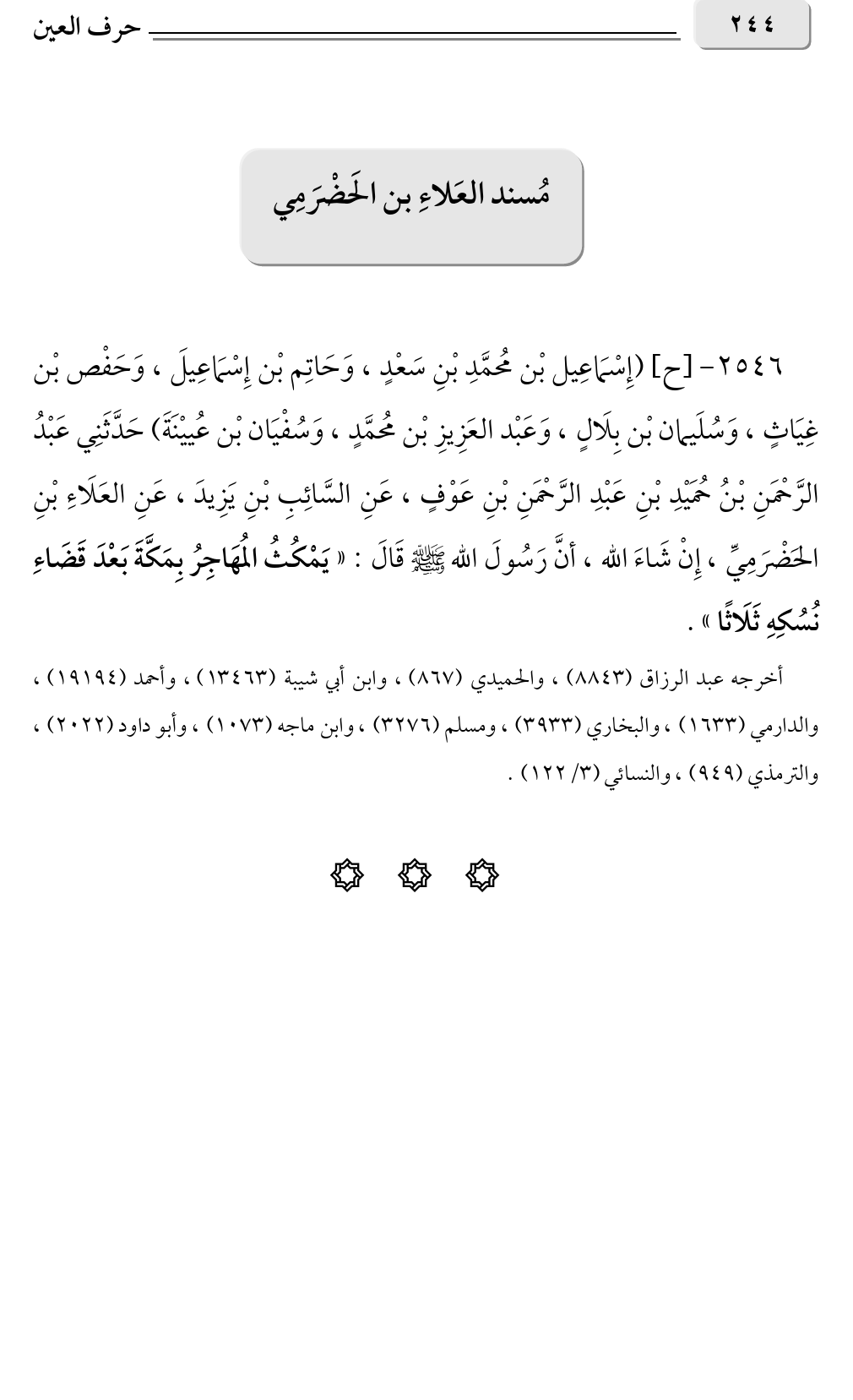 ٢٥٤٦ - [ح] (إِسْمَاعِيل بْن مُحمَّدِ بْنِ سَعْدٍ، وَحَاتِم بْن إِسْمَاعِيلَ، وَحَفْص بْن غِيَاثٍ، وَسُلَيمان بْن بِلَالٍ، وَعَبْد العَزِيزِ بْن مُحمَّدٍ، وَسُفْيَان بْن عُييْنَةَ) حَدَّثَنِي عَبْدُ الرَّحْمَنِ بْنُ حُمَيْدِ بْنِ عَبْدِ الرَّحْمَنِ بْنِ عَوْفٍ، عَنِ السَّائِبِ بْنِ يَزِيدَ، عَنِ العَلَاءِ بْنِ الحَضْرَمِيِّ، إِنْ شَاءَ الله، أنَّ رَسُولَ الله صلى الله عليه وسلم قَالَ: «يَمْكُثُ المُهَاجِرُ بِمَكَّةَ بَعْدَ قَضَاءِ نُسُكِهِ ثَلَاثًا».