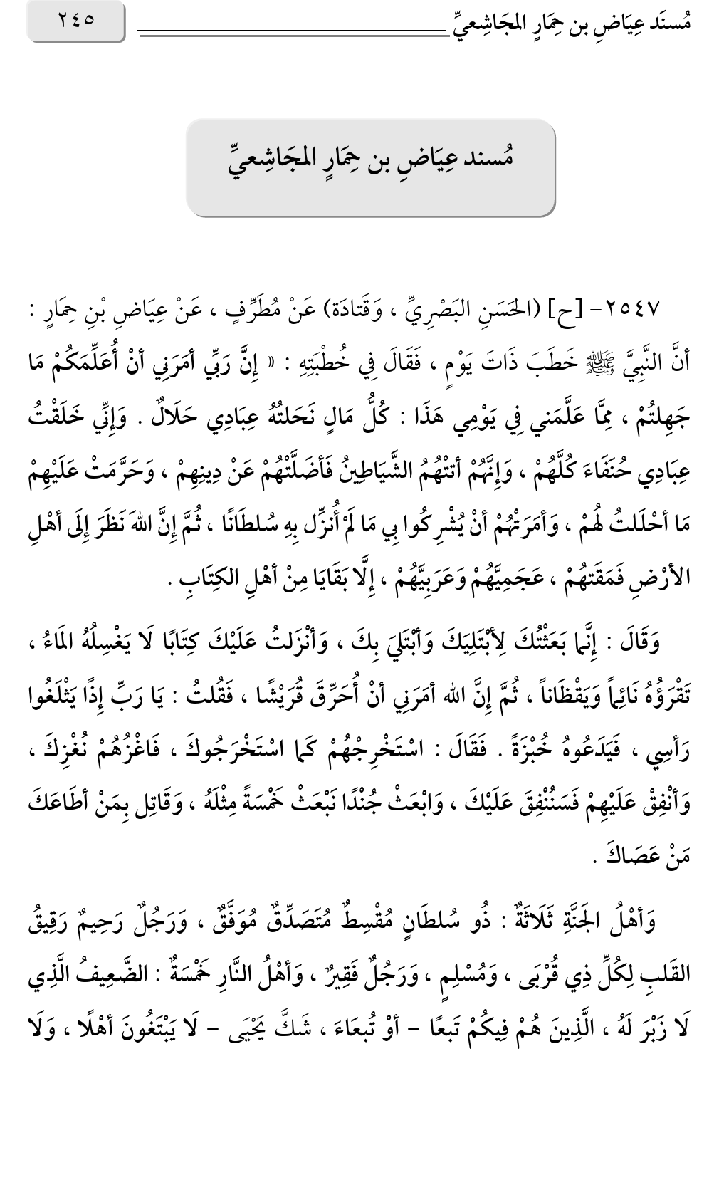 ٢٥٤٧ - [ح] (الحَسَنِ البَصْرِيِّ، وَقَتادَة) عَنْ مُطَرِّفٍ، عَنْ عِيَاضِ بْنِ حِمَارٍ: أنَّ النَّبِيَّ صلى الله عليه وسلم خَطَبَ ذَاتَ يَوْمٍ، فَقَالَ فِي خُطْبَتِهِ: «إِنَّ رَبِّي أمَرَنِي أنْ أُعَلِّمَكُمْ مَا جَهِلتُمْ، مِمَّا عَلَّمَني فِي يَوْمِي هَذَا: كُلُّ مَالٍ نَحَلتُهُ عِبَادِي حَلَالٌ. وَإِنِّي خَلَقْتُ عِبَادِي حُنَفَاءَ كُلَّهُمْ، وَإِنَّهُمْ أتتْهُمُ الشَّيَاطِينُ فَأضَلَّتْهُمْ عَنْ دِينِهِمْ، وَحَرَّمَتْ عَلَيْهِمْ مَا أحْلَلتُ لُهمْ، وَأمَرَتْهُمْ أنْ يُشْرِكُوا بِي مَا لَمْ أُنزِّل بِهِ سُلطَانًا، ثُمَّ إِنَّ اللهَ نَظَرَ إِلَى أهْلِ الأرْضِ فَمَقَتهُمْ، عَجَمِيَّهُمْ وَعَرَبِيَّهُمْ، إِلَّا بَقَايَا مِنْ أهْلِ الكِتَابِ.