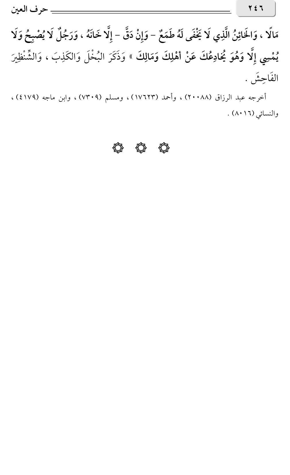 مَالًا، وَالخَائِنُ الَّذِي لَا يَخْفَى لَهُ طَمَعٌ - وَإِنْ دَقَّ - إِلَّا خَانَهُ، وَرَجُلٌ لَا يُصْبِحُ وَلَا يُمْسِي إِلَّا وَهُوَ يُخادِعُكَ عَنْ أهْلِكَ وَمَالِكَ» وَذَكَرَ البُخْلَ وَالكَذِبَ، وَالشِّنْظِيرَ الفَاحِشَ.