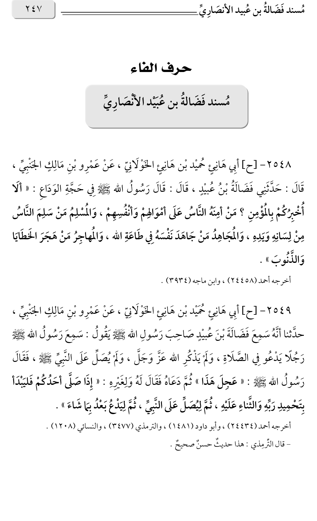 ٢٥٤٨ - [ح] أبِي هَانِئٍ حُميْد بْن هَانِئٍ الخَوْلَانِيّ، عَنْ عَمْرِو بْنِ مَالِكٍ الجَنْبِيِّ، قَالَ: حَدَّثَنِي فَضَالَةُ بْنُ عُبيْدٍ، قَالَ: قَالَ رَسُولُ الله صلى الله عليه وسلم فِي حَجَّةِ الوَدَاعِ: «ألَا أُخْبِرُكُمْ بِالمُؤْمِنِ؟ مَنْ أمِنَهُ النَّاسُ عَلَى أمْوَالهِمْ وَأنْفُسِهِمْ، وَالمُسْلِمُ مَنْ سَلِمَ النَّاسُ مِنْ لِسَانِهِ وَيَدِهِ، وَالمُجَاهِدُ مَنْ جَاهَدَ نَفْسَهُ فِي طَاعَةِ الله، وَالمُهاجِرُ مَنْ هَجَرَ الخَطَايَا وَالذَّنُوبَ».