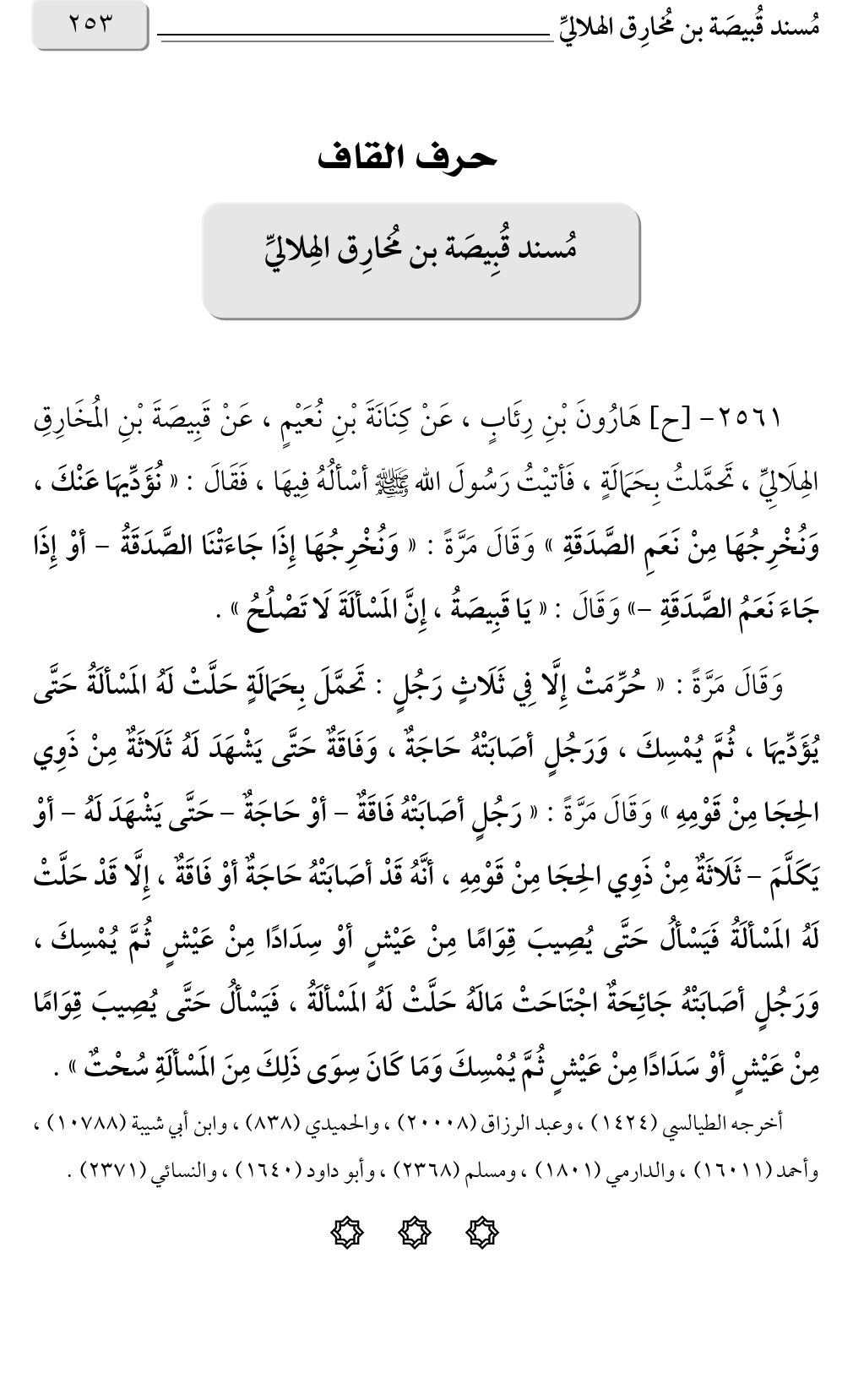 ٢٥٦١ - [ح] هَارُونَ بْنِ رِئَابٍ، عَنْ كِنَانَةَ بْنِ نُعَيْمٍ، عَنْ قَبِيصَةَ بْنِ المُخَارِقِ الهِلَالِيِّ، تَحمَّلتُ بِحَمَالَةٍ، فَأتيْتُ رَسُولَ الله صلى الله عليه وسلم أسْألُهُ فِيهَا، فَقَالَ: «نُؤَدِّيهَا عَنْكَ، وَنُخْرِجُهَا مِنْ نَعَمِ الصَّدَقَةِ» وَقَالَ مَرَّةً: «وَنُخْرِجُهَا إِذَا جَاءَتْنَا الصَّدَقَةُ - أوْ إِذَا - جَاءَ نَعَمُ الصَّدَقَةِ» وَقَالَ: «يَا قَبِيصَةُ، إِنَّ المَسْألَةَ لَا تَصْلُحُ».