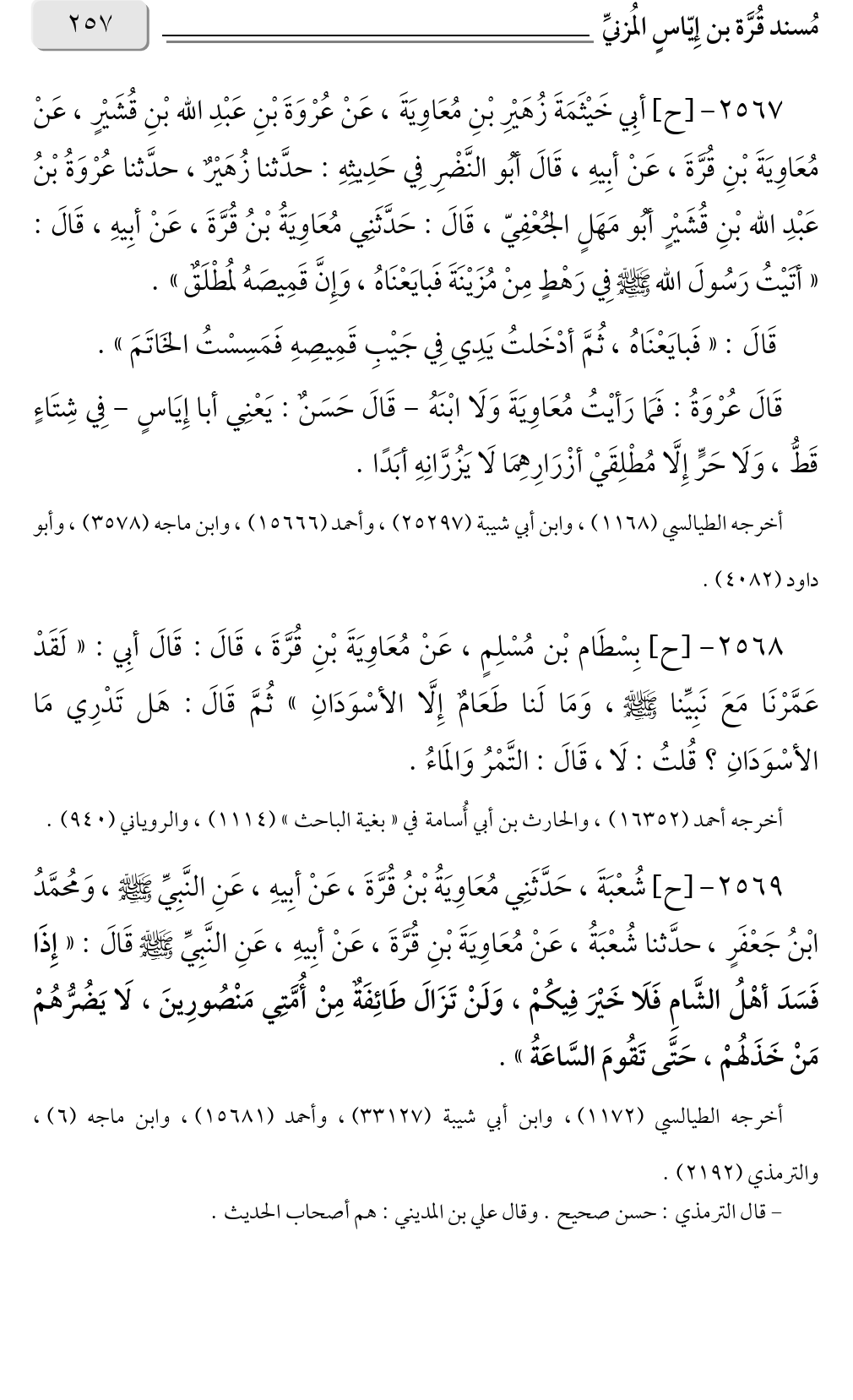 ٢٥٦٧ - [ح] أبِي خَيْثَمَةَ زُهَيْرِ بْنِ مُعَاوِيَةَ، عَنْ عُرْوَةَ بْنِ عَبْدِ الله بْنِ قُشَيْرٍ، عَنْ مُعَاوِيَةَ بْنِ قُرَّةَ، عَنْ أبِيهِ، قَالَ أبُو النَّضْرِ فِي حَدِيثِهِ: حدَّثنا زُهَيْرٌ، حدَّثنا عُرْوَةُ بْنُ عَبْدِ الله بْنِ قُشَيْرٍ أبُو مَهَلٍ الجُعْفِيّ، قَالَ: حَدَّثَنِي مُعَاوِيَةُ بْنُ قُرَّةَ، عَنْ أبِيهِ، قَالَ: «أتَيْتُ رَسُولَ الله صلى الله عليه وسلم فِي رَهْطٍ مِنْ مُزَيْنَةَ فَبايَعْنَاهُ، وَإِنَّ قَمِيصَهُ لمُطْلَقٌ».