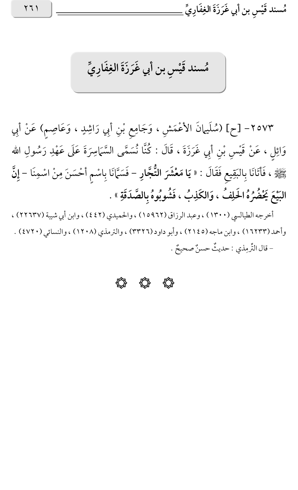 ٢٥٧٣ - [ح] (سُلَيمانَ الأعْمَشِ، وَجَامِعِ بْنِ أبِي رَاشِدٍ، وَعَاصِمٍ) عَنْ أبِي وَائِلٍ، عَنْ قَيْسِ بْنِ أبِي غَرَزَةَ، قَالَ: كُنَّا نُسَمَّى السَّمَاسِرَةَ عَلَى عَهْدِ رَسُولِ الله صلى الله عليه وسلم، فَأتَانَا بِالبَقِيعِ فَقَالَ: «يَا مَعْشَرَ التُّجَّارِ - فَسَمَّانَا بِاسْمٍ أحْسَنَ مِنْ اسْمِنَا - إِنَّ البَيْعَ يَحْضُرُهُ الحَلِفُ، وَالكَذِبُ، فَشُوبُوهُ بِالصَّدَقَةِ».