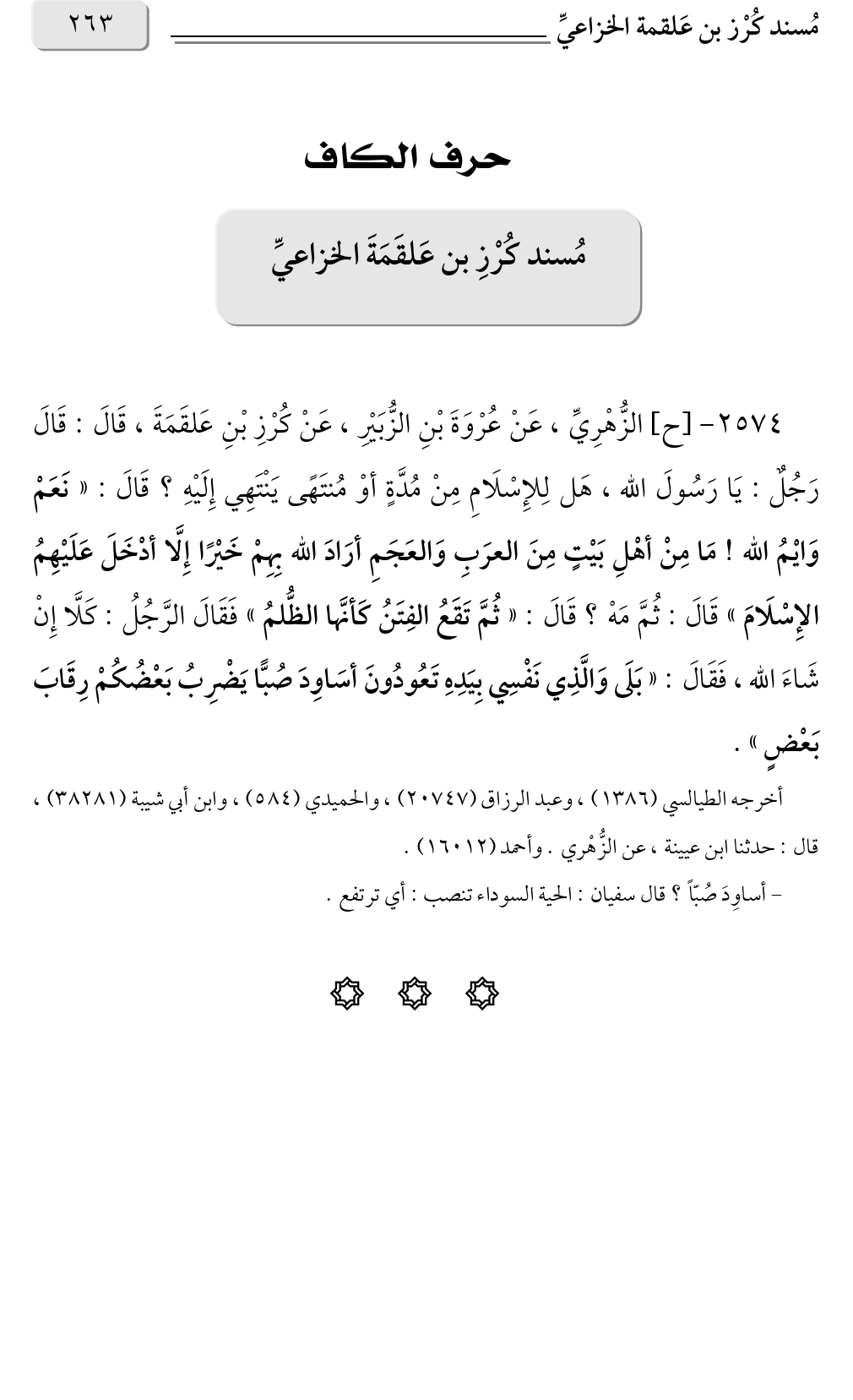 ٢٥٧٤ - [ح] الزُّهْرِيِّ، عَنْ عُرْوَةَ بْنِ الزُّبَيْرِ، عَنْ كُرْزِ بْنِ عَلقَمَةَ، قَالَ: قَالَ رَجُلٌ: يَا رَسُولَ الله، هَل لِلإِسْلَامِ مِنْ مُدَّةٍ أوْ مُنتَهًى يَنْتَهِي إِلَيْهِ؟ قَالَ: «نَعَمْ وَايْمُ الله! مَا مِنْ أهْلِ بَيْتٍ مِنَ العرَبِ وَالعَجَمِ أرَادَ الله بِهِمْ خَيْرًا إِلَّا أدْخَلَ عَلَيْهِمُ الإِسْلَامَ» قَالَ: ثُمَّ مَهْ؟ قَالَ: «ثُمَّ تَقَعُ الفِتَنُ كَأنَّها الظُّلمُ» فَقَالَ الرَّجُلُ: كَلَّا إِنْ شَاءَ الله، فَقَالَ: «بَلَى وَالَّذِي نَفْسِي بِيَدِهِ تَعُودُونَ أسَاوِدَ صُبًّا يَضْرِبُ بَعْضُكُمْ رِقَابَ بَعْضٍ».