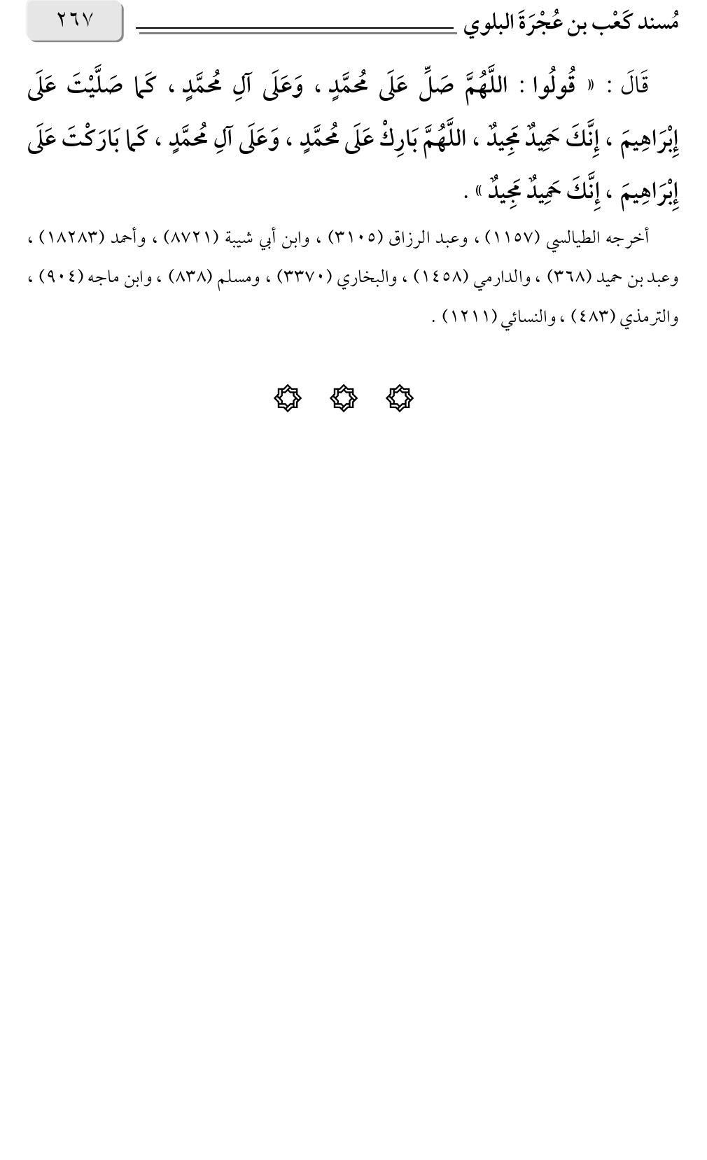 قَالَ: «قُولُوا: اللَّهُمَّ صَلِّ عَلَى مُحمَّدٍ، وَعَلَى آلِ مُحمَّدٍ، كَما صَلَّيْتَ عَلَى إِبْرَاهِيمَ، إِنَّكَ حَمِيدٌ مَجِيدٌ، اللَّهُمَّ بَارِكْ عَلَى مُحمَّدٍ، وَعَلَى آلِ مُحمَّدٍ، كَما بَارَكْتَ عَلَى إِبْرَاهِيمَ، إِنَّكَ حَمِيدٌ مَجِيدٌ».