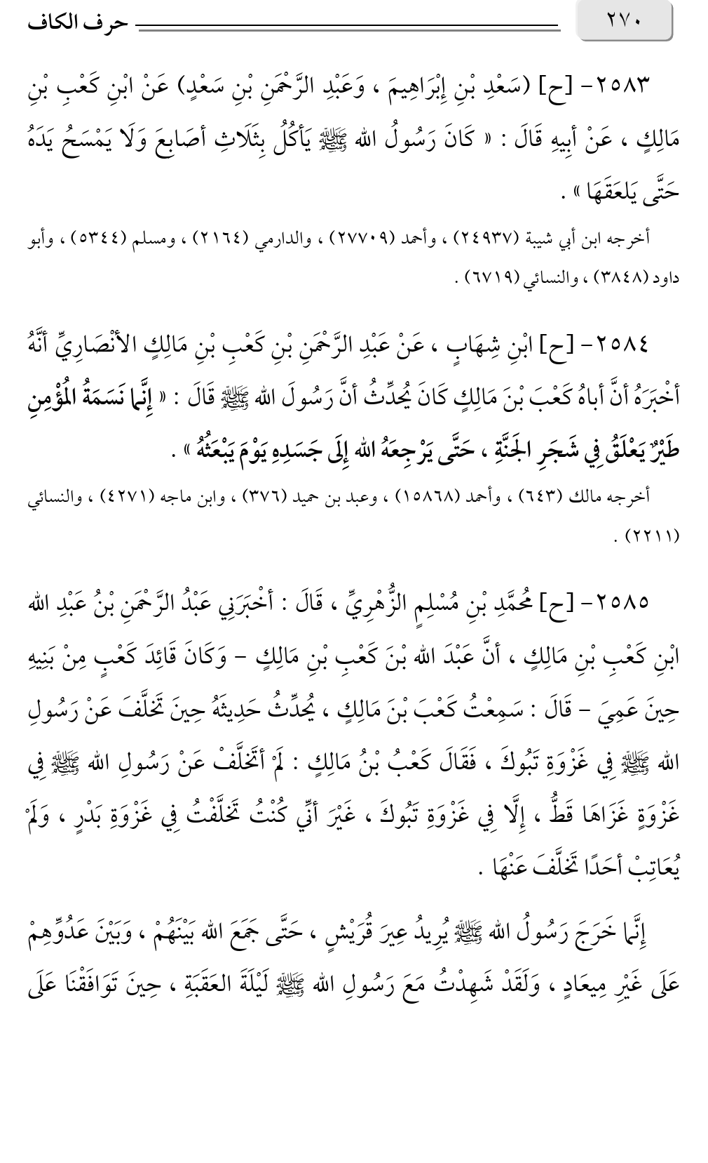 ٢٥٨٥ - [ح] مُحمَّدِ بْنِ مُسْلِمٍ الزُّهْرِيِّ، قَالَ: أخْبَرَنِي عَبْدُ الرَّحْمَنِ بْنُ عَبْدِ الله ابْنِ كَعْبِ بْنِ مَالِكٍ، أنَّ عَبْدَ الله بْنَ كَعْبِ بْنِ مَالِكٍ - وَكَانَ قَائِدَ كَعْبٍ مِنْ بَنِيهِ حِينَ عَمِيَ - قَالَ: سَمِعْتُ كَعْبَ بْنَ مَالِكٍ، يُحدِّثُ حَدِيثَهُ حِينَ تَخلَّفَ عَنْ رَسُولِ الله صلى الله عليه وسلم فِي غَزْوَةِ تَبُوكَ، فَقَالَ كَعْبُ بْنُ مَالِكٍ: لَمْ أتَخلَّفْ عَنْ رَسُولِ الله صلى الله عليه وسلم فِي غَزْوَةٍ غَزَاهَا قَطُّ، إِلَّا فِي غَزْوَةِ تَبُوكَ، غَيْرَ أنِّي كُنْتُ تَخلَّفْتُ فِي غَزْوَةِ بَدْرٍ، وَلَمْ يُعَاتِبْ أحَدًا تَخلَّفَ عَنْهَا.